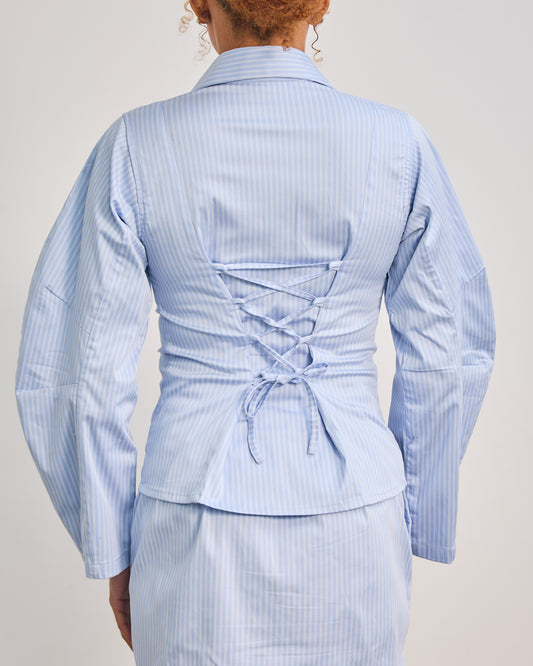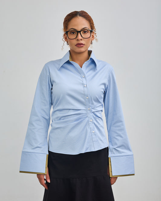 The Fitted Barrel Shirt with a Tie-Back Detail - Powder Blue Stripped