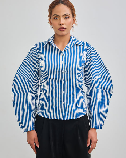 The Fitted Barrel Shirt with a Tie-Back Detail - Blue Stripped