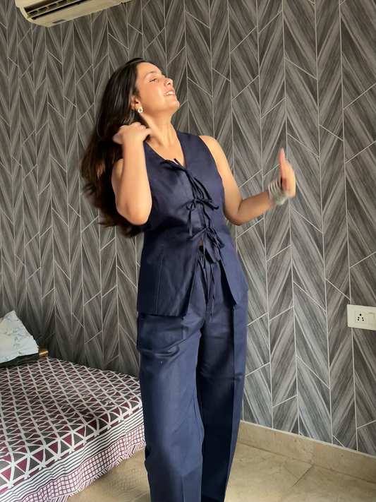 Navy Blue Linen Tie Up Vest and Pants Set
