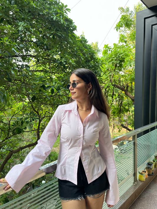 Baby Pink Striped Fitted Shirt – Cotton Poplin Shirt with Tie-Back Detail