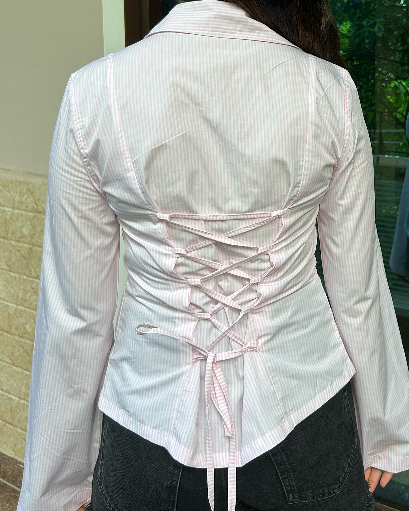 Baby Pink Striped Fitted Shirt – Cotton Poplin Shirt with Tie-Back Detail