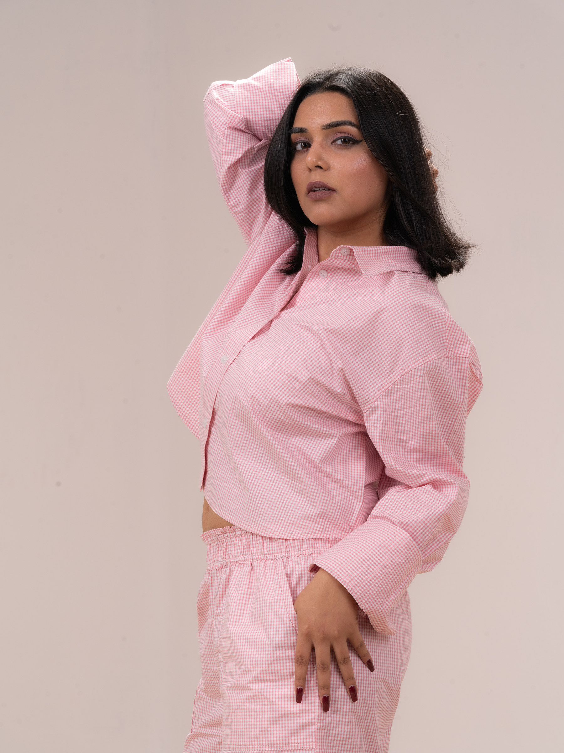 The focal point of this ensemble is our cropped shirt, adorned with a delightful peach gingham pattern that adds a touch of whimsy to your beachside look. The cropped silhouette is perfect for basking in the sun's rays, while the lightweight fabric ensures you stay cool and comfortable all day long. Whether you're lounging on the sand or sipping cocktails at a beachside cafe, this shirt is sure to turn heads.