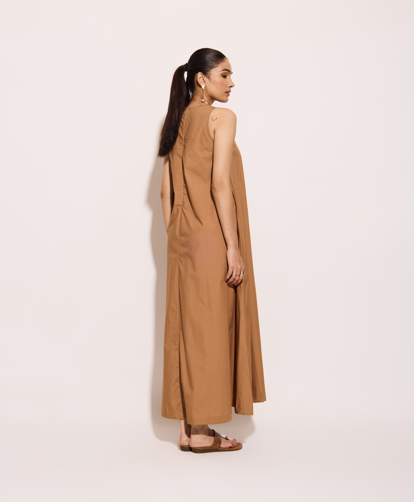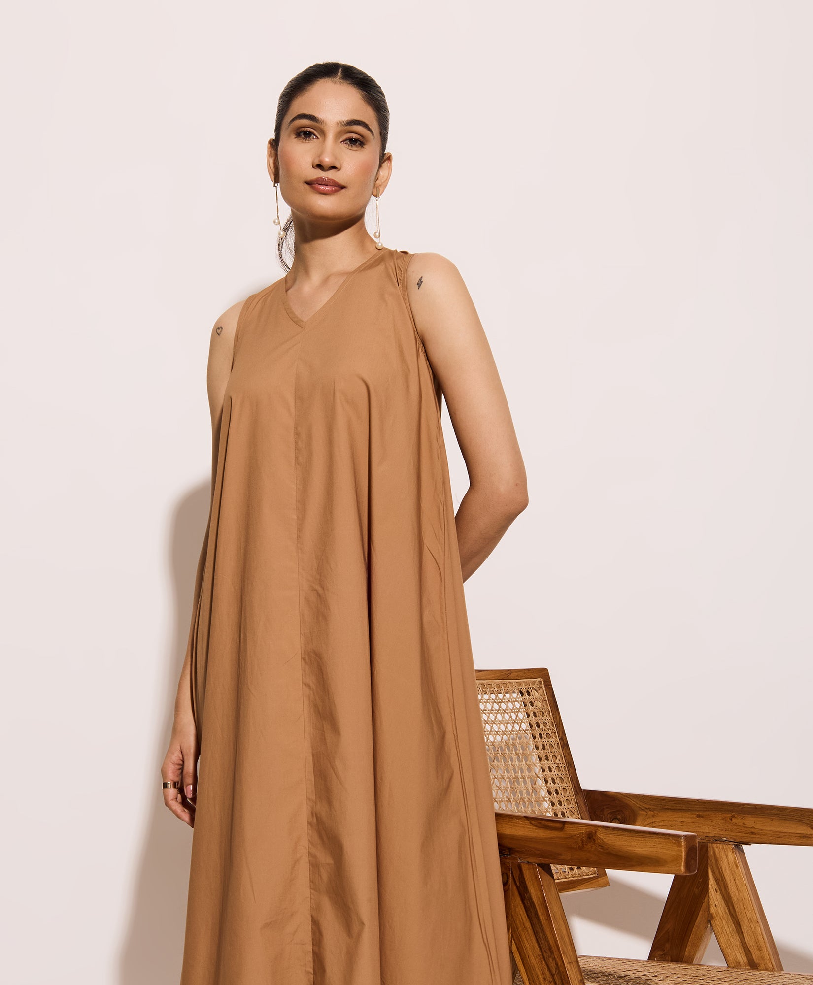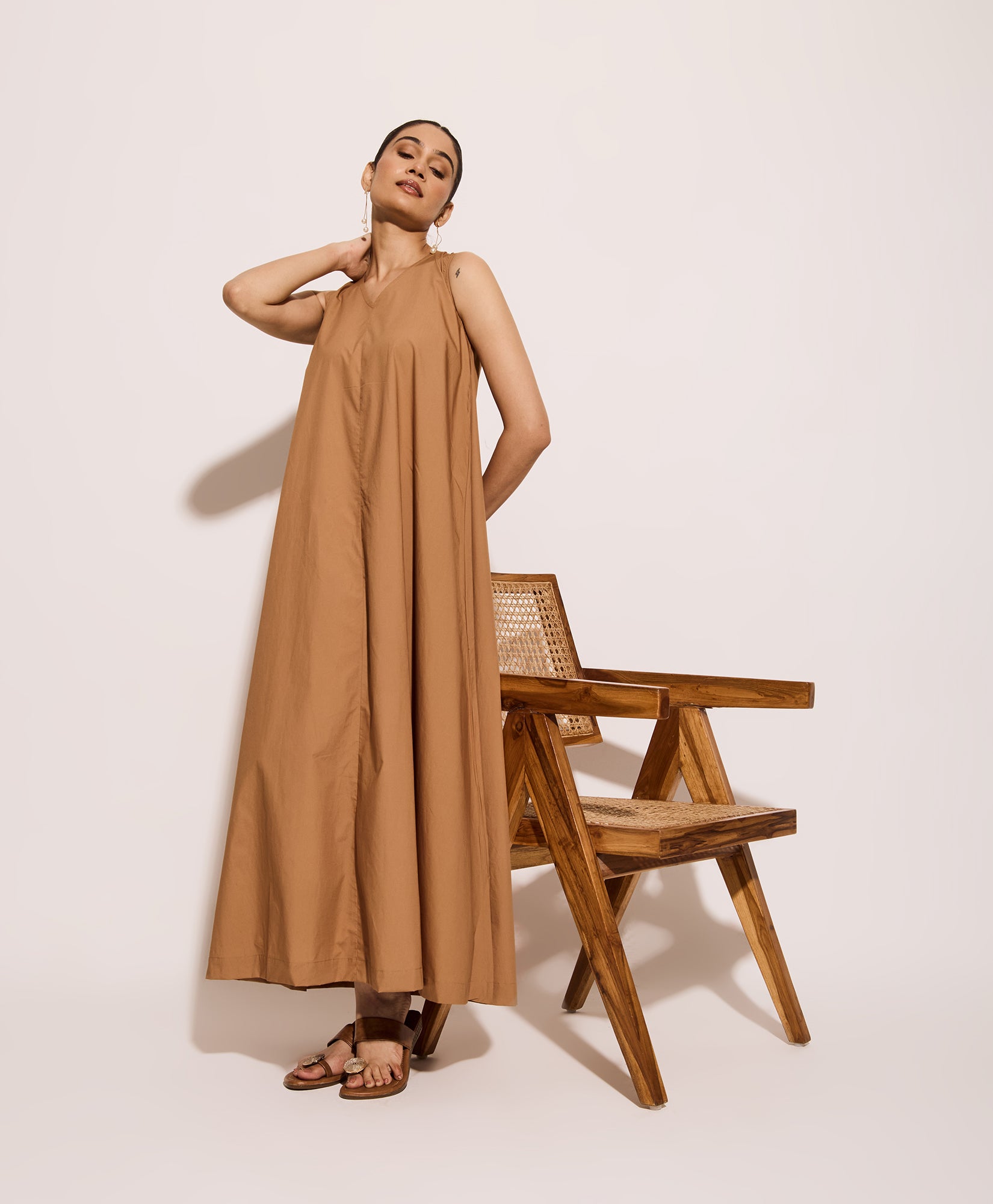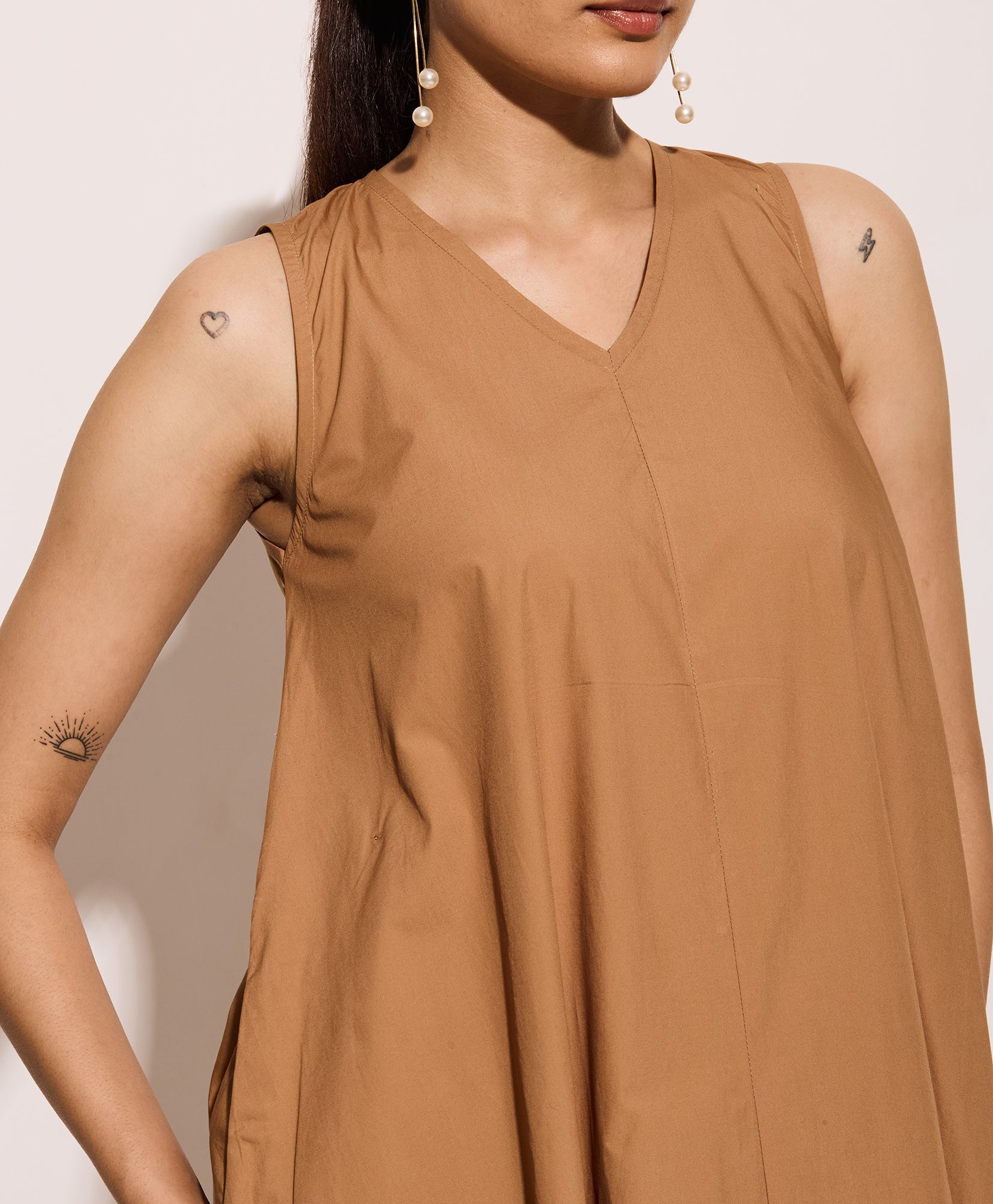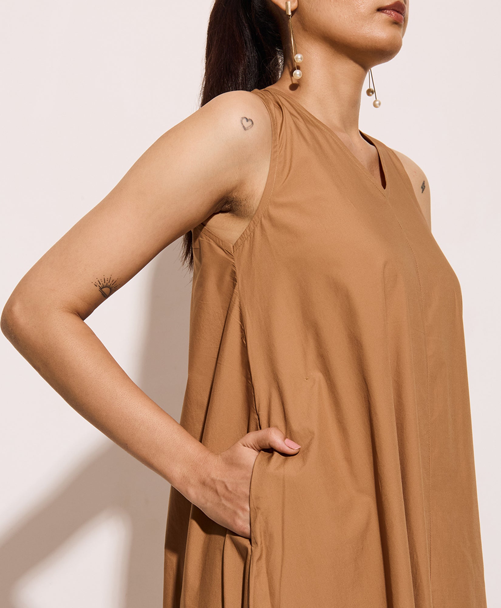 Effortless elegance meets modern ease in this beautifully tailored beige poplin dress. Crafted from breathable, lightweight cotton poplin, this A-line swing silhouette drapes gently to create a relaxed yet refined shape. The high neckline and sleeveless cut give it a polished edge, while the generous flare offers movement and comfort.