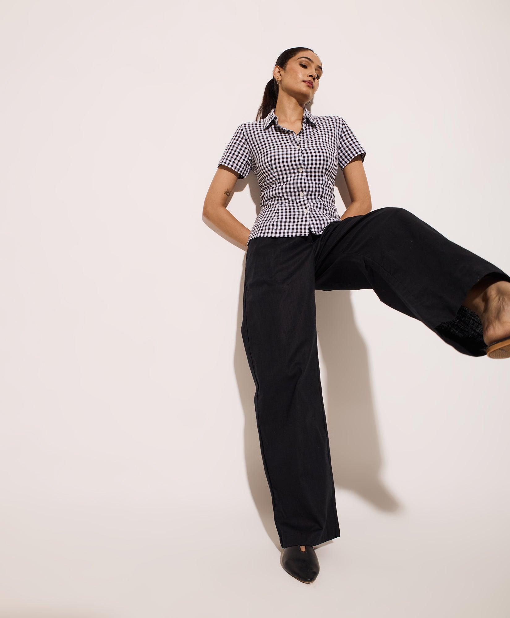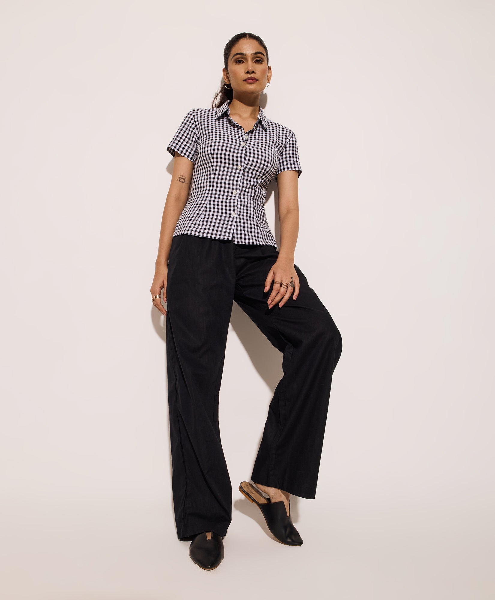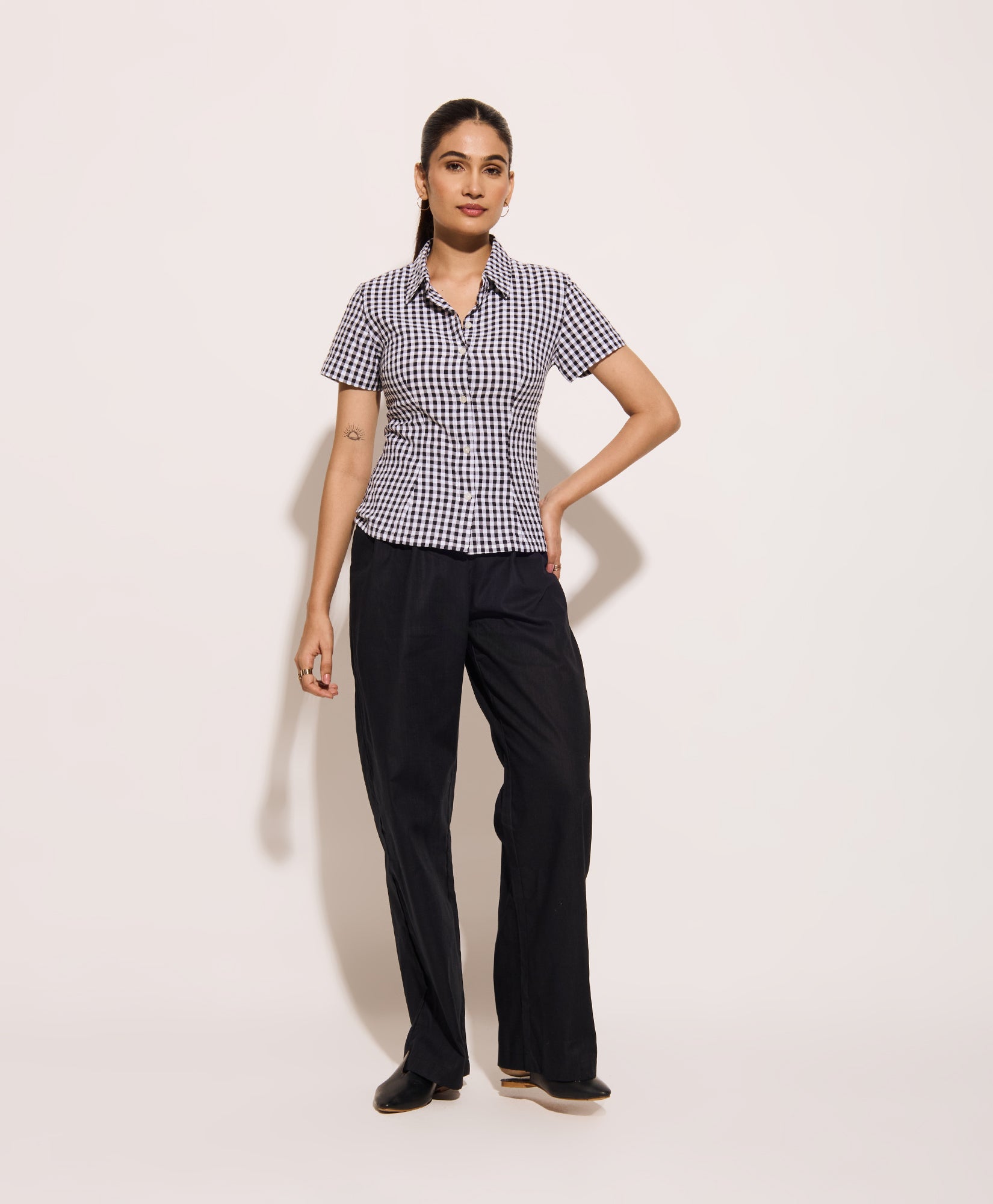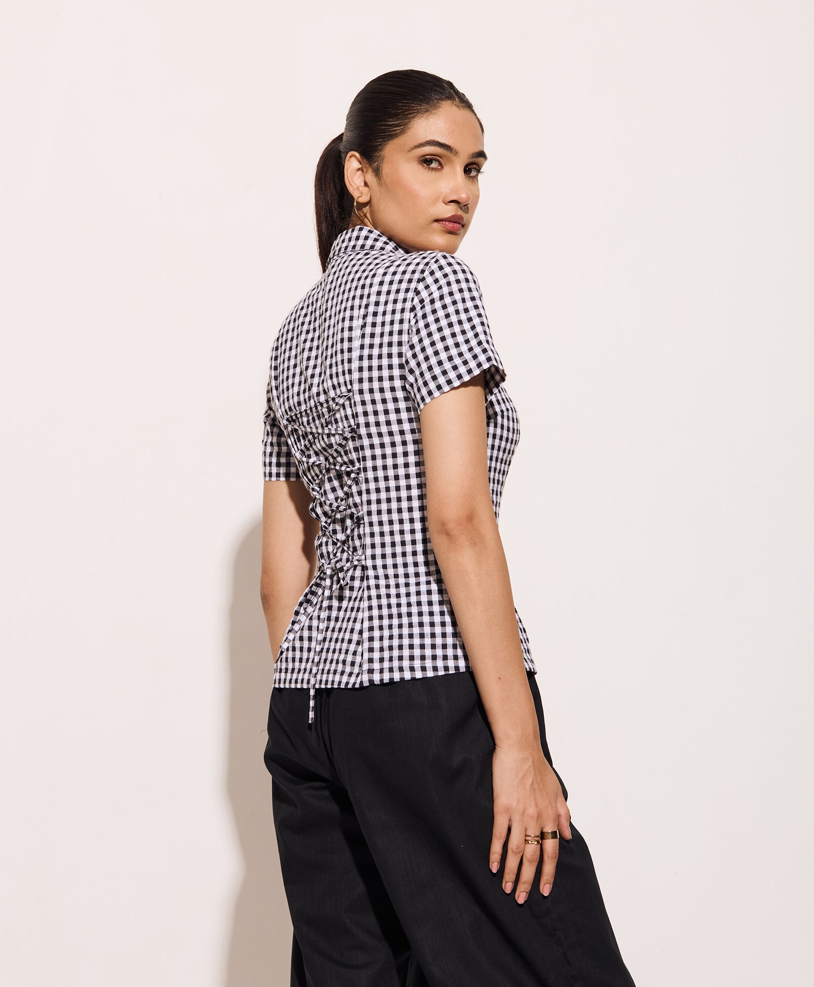 This black gingham half sleeves fitted shirt is designed with a front button-down closure and a classic collar for timeless appeal. The tailored silhouette features a unique lace-up tie back, offering an adjustable fit and subtle detail. Lightweight cotton fabric ensures comfort, making it ideal for summer workwear, travel, or casual outings. The black gingham pattern adds a versatile touch, easily paired with trousers or skirts for effortless styling. This fitted gingham shirt with a tie-back detail is a wardrobe essential for refined, everyday looks and makes a statement for both weekday and weekend wear