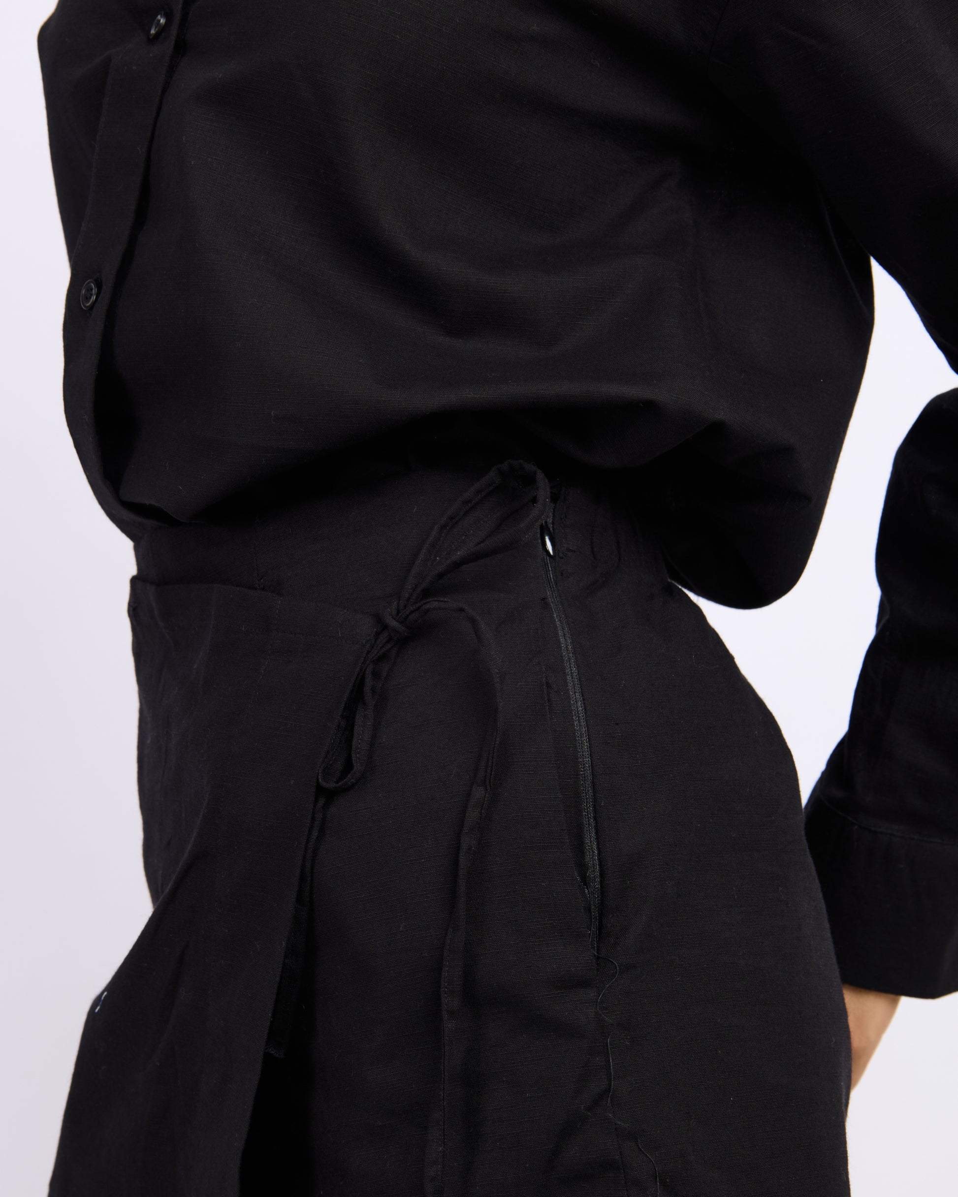 Strike the perfect balance between style and comfort with this black cotton linen skort. Designed to offer the ease of shorts with the appearance of a skirt, this piece features a cleverly constructed adjustable front tie-up flap for a clean, wrap-style finish. The breathable cotton-linen blend makes it an ideal choice for warm days, while the versatile silhouette can be dressed up or down for any occasion.