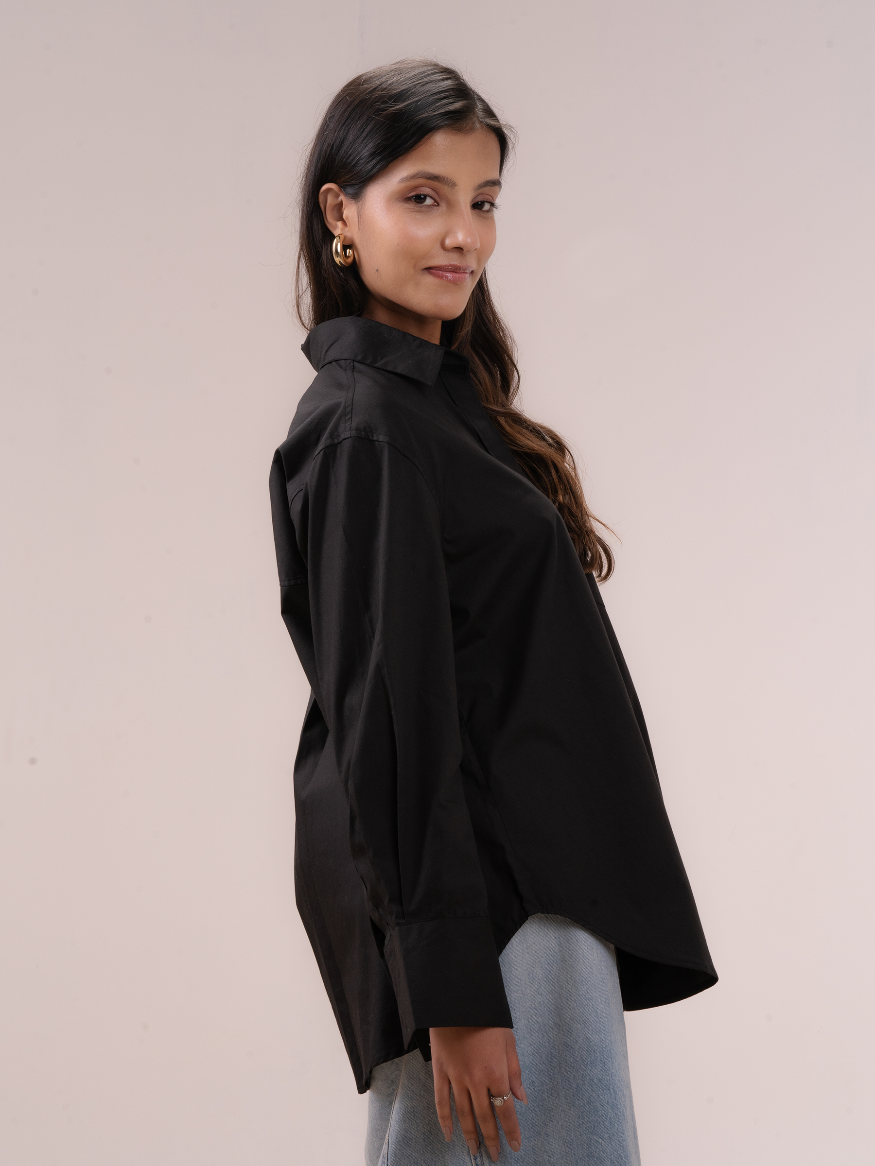 Tags: black oversized shirt women, cotton poplin shirt, oversized black button-down, classic black shirt, relaxed fit shirt, breathable cotton shirt, wardrobe essentials for women