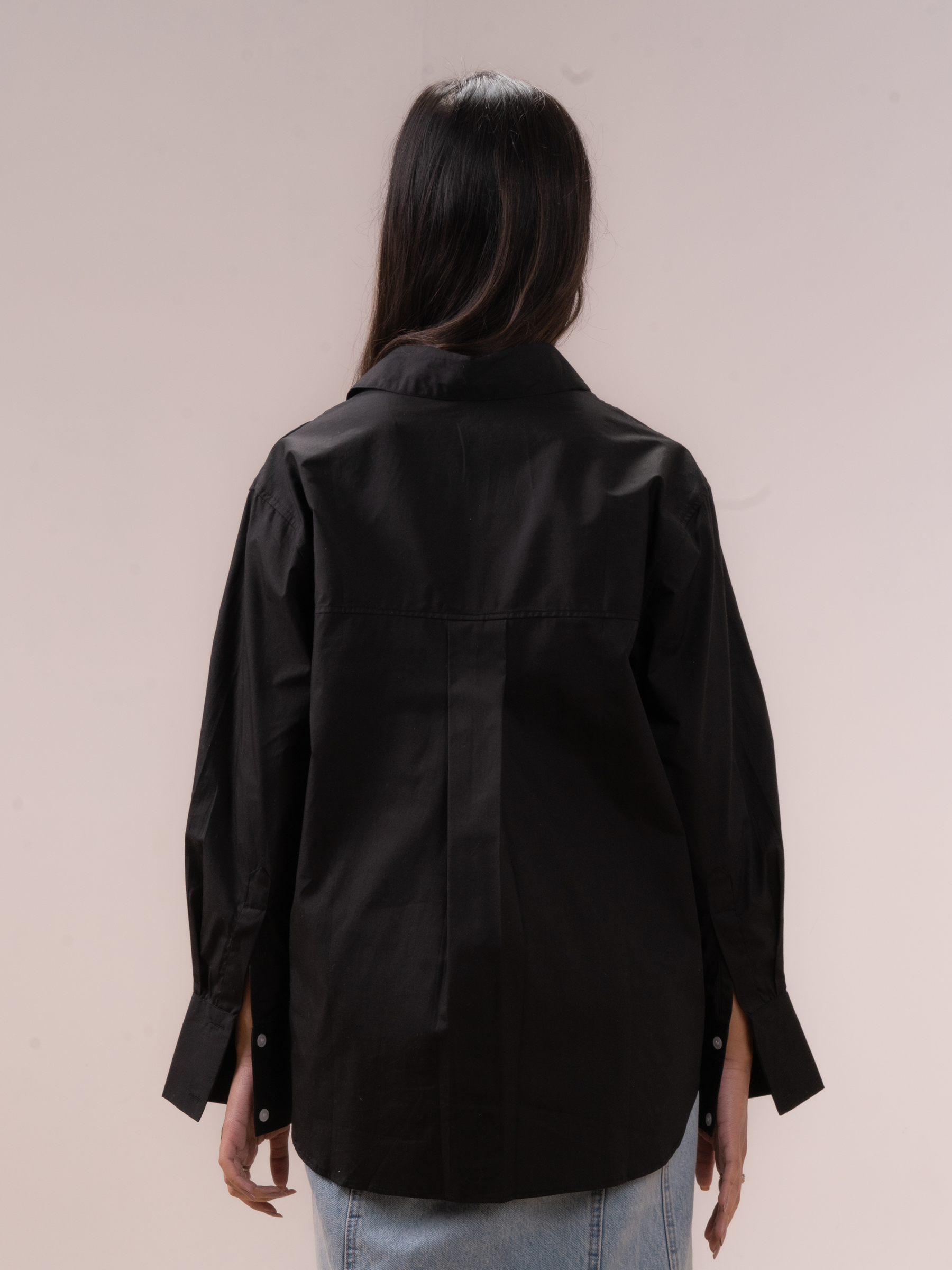 With its oversized silhouette, clean lines, and classic button-down design, it effortlessly blends comfort with elegance. Whether you're dressing up for a meeting or keeping it casual for the weekend, this black shirt is the ultimate wardrobe staple that goes with everything.
