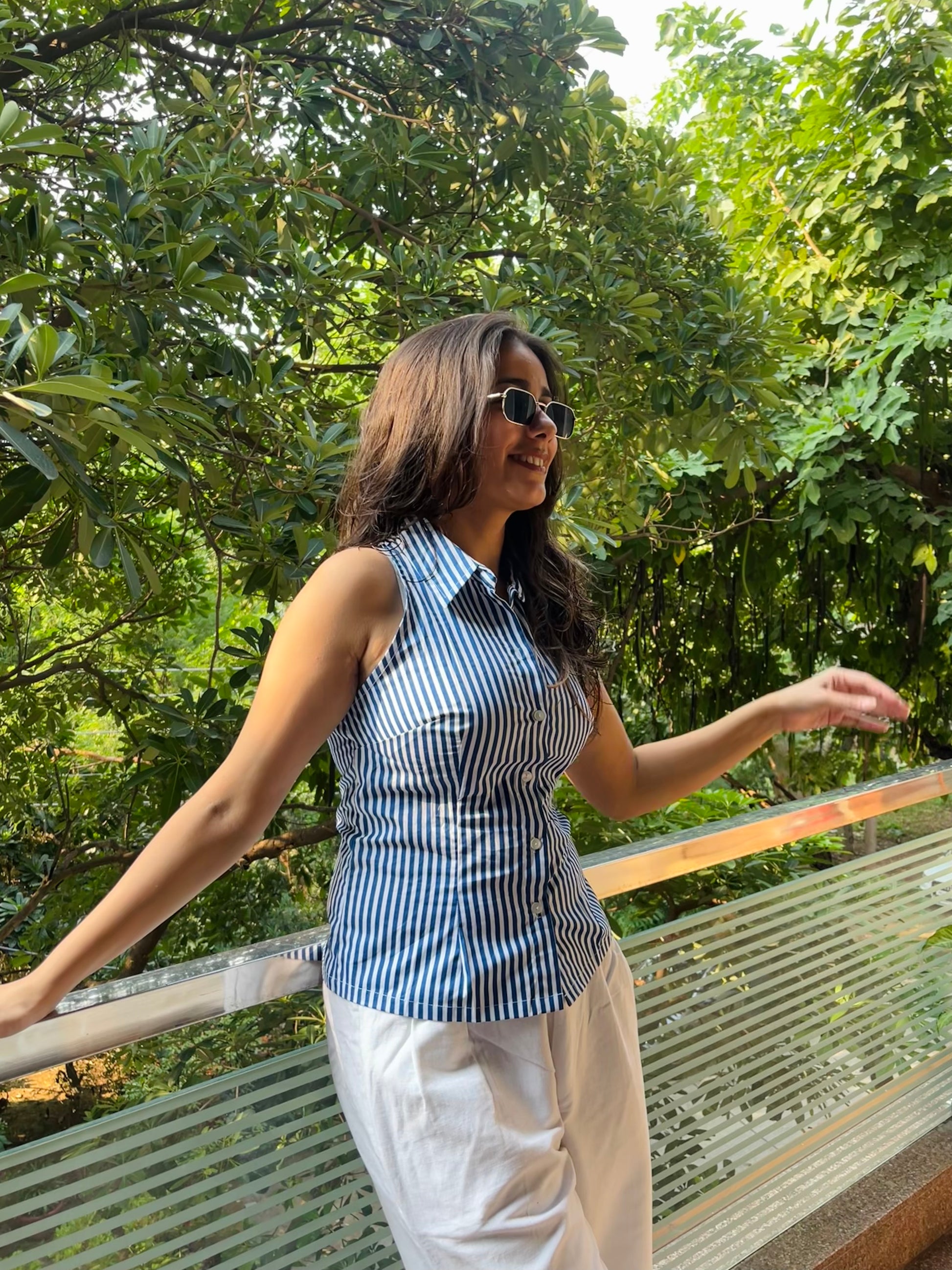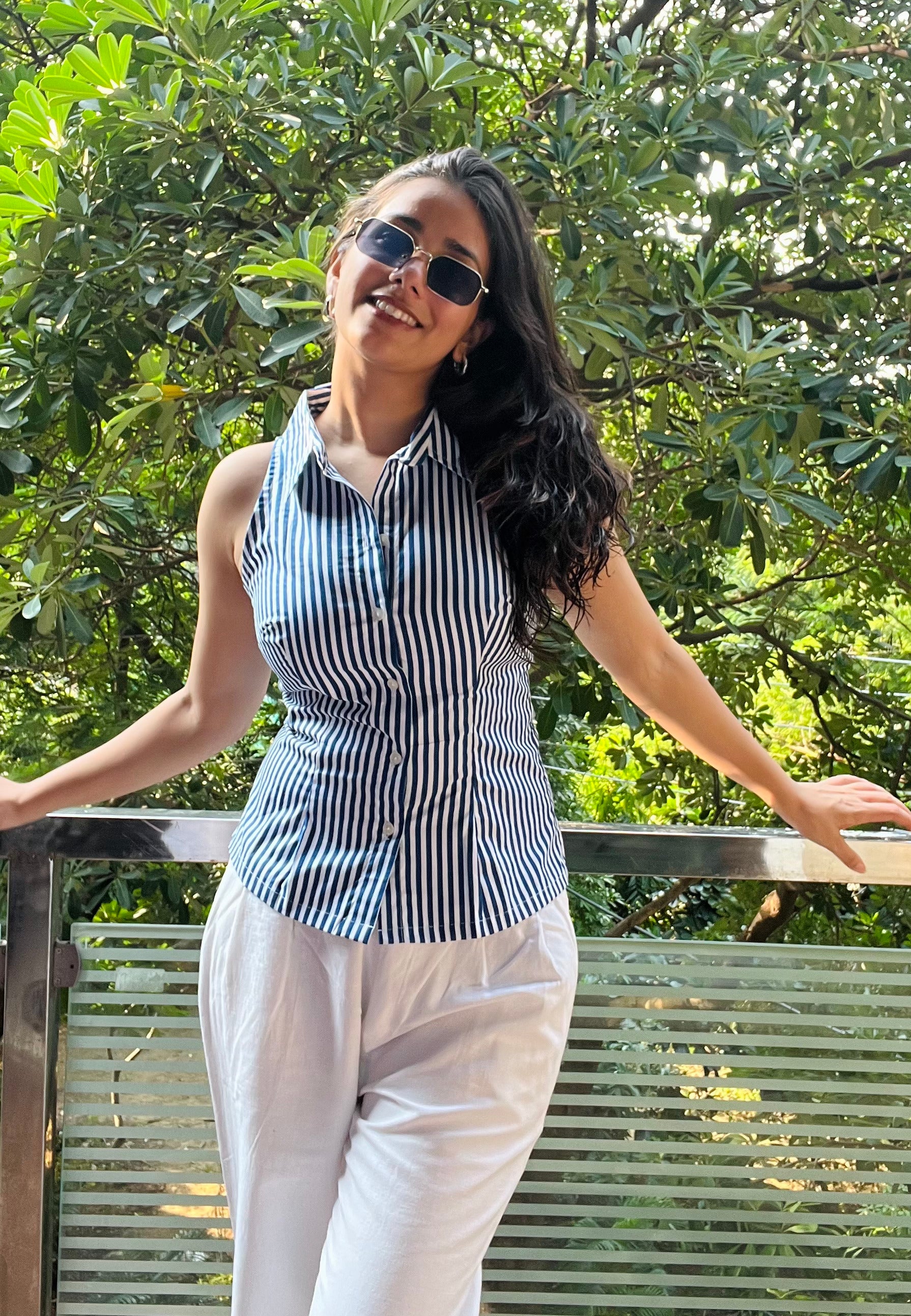 Blue Halter Neck Slim Fit Shirt – Cotton Shirt with Tie-Back Detail