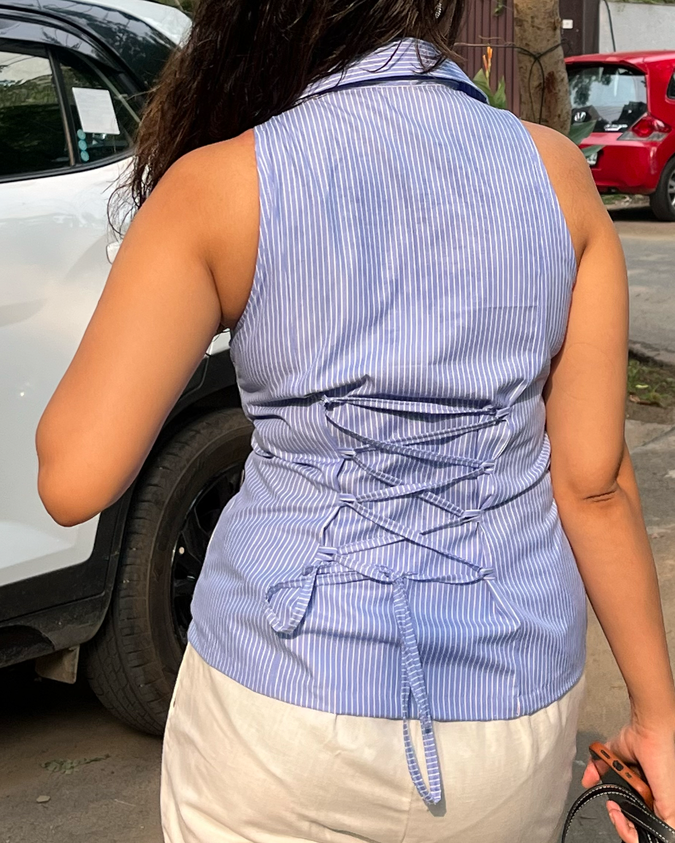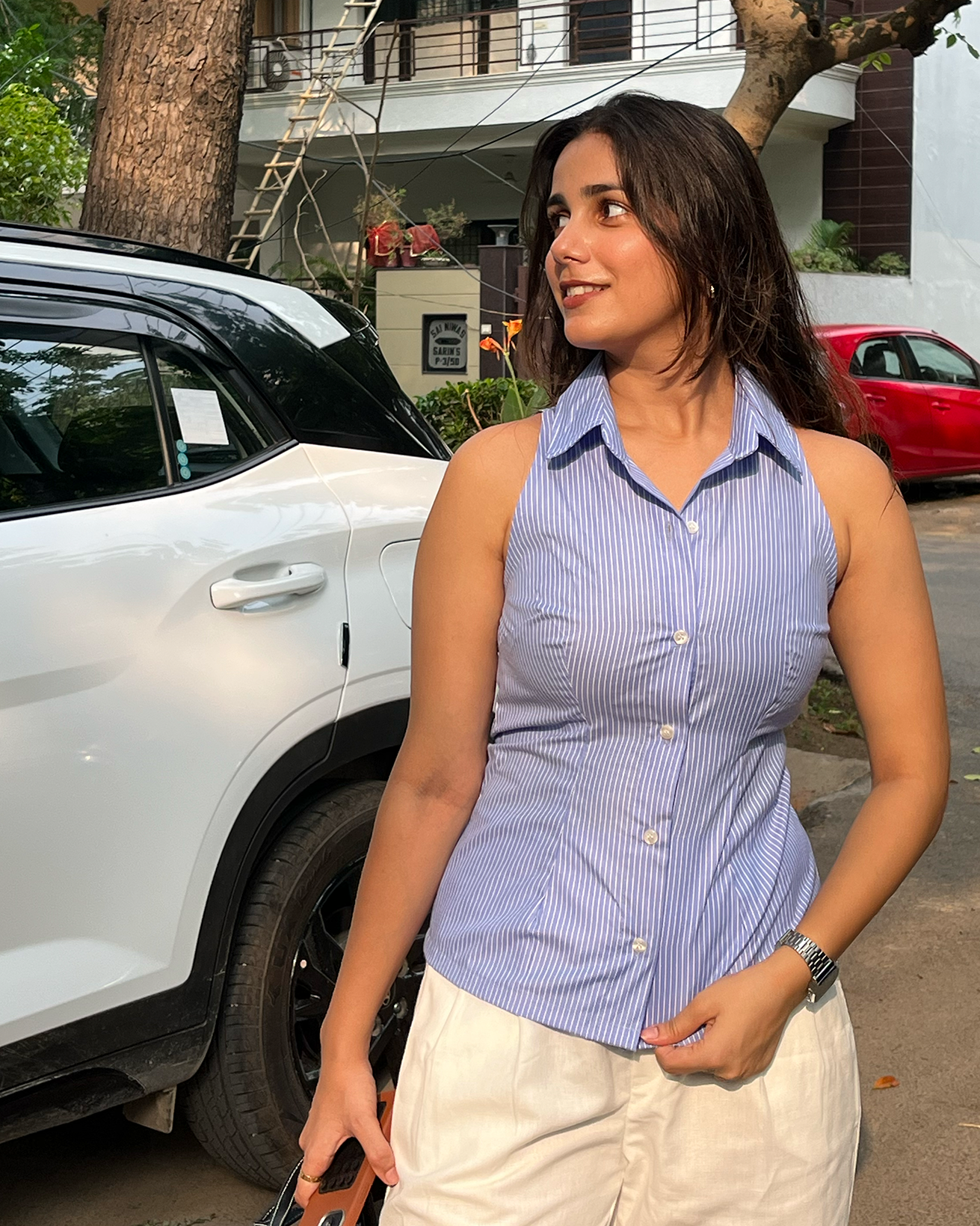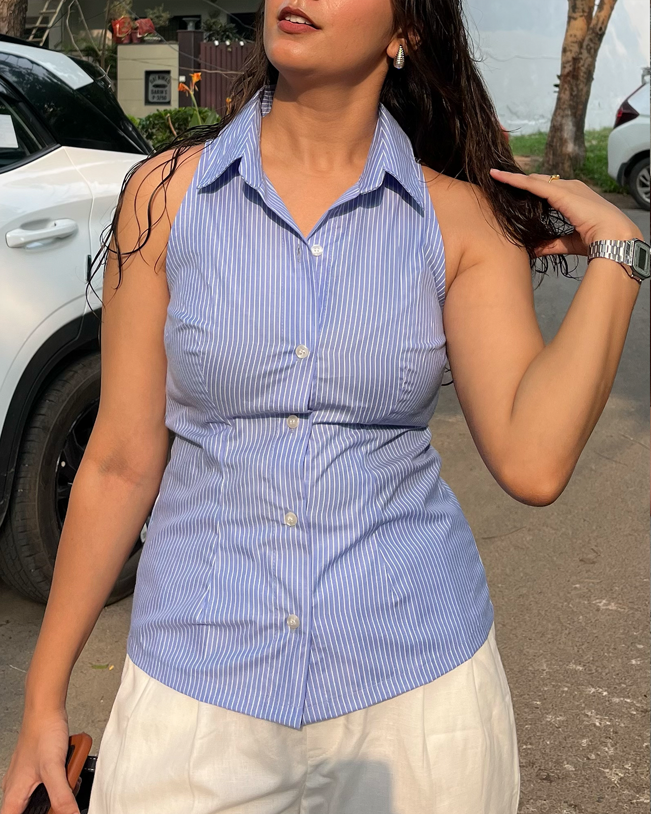 Light Blue Striped Halter Neck Fitted Shirt – Tie-Back Detail