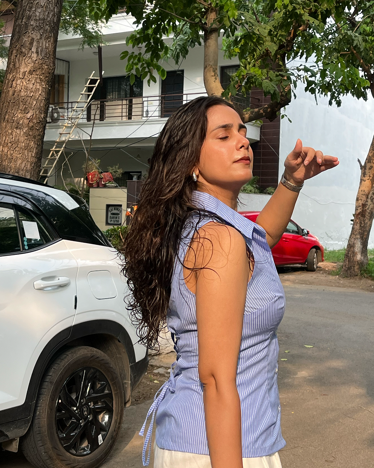 The Blue Striped Halter Neck Fitted Shirt — a chic, breathable cotton shirt for women, designed to blend modern tailoring with comfort. Crafted from structured cotton lycra, this waist-length slim-fit shirt features bell sleeves and a tie-back detail for a custom fit and soft, feminine silhouette.