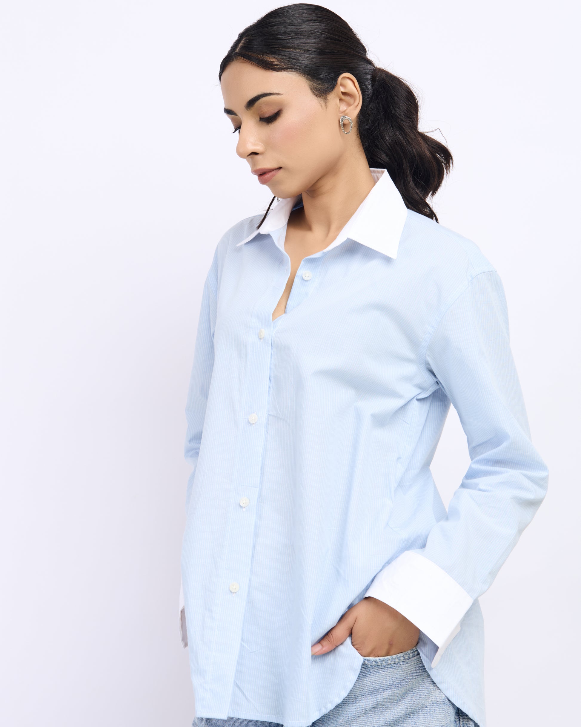 Keywords: Blue Striped Shirt, White Collar Shirt, Shirt with White Cuffs, Cotton Striped Shirt, Casual Office Shirt, Women's Classic Shirts, Smart Casual Shirts, old money vibe shirt