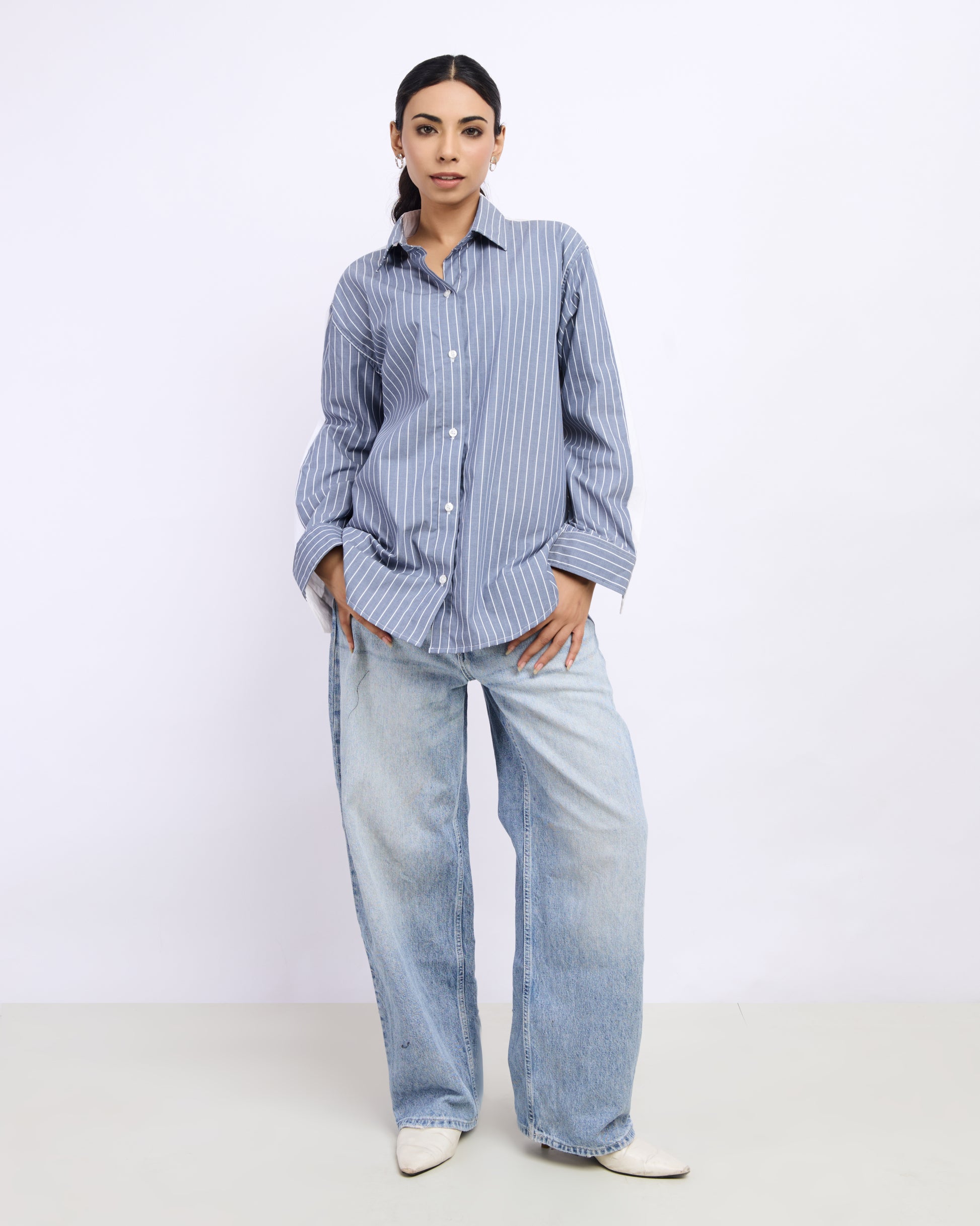 Step up your casual chic game with this uniquely designed dual-tone shirt. Featuring a stylish contrast of a crisp white back and classic vertical blue pinstripes on the front, this shirt redefines everyday elegance. Crafted from a soft, breathable fabric, it offers a relaxed fit perfect for all-day comfort. The drop shoulders, long sleeves, and button-down front create a timeless yet modern silhouette. Whether you pair it with jeans for a laid-back look or dress it up with trousers, this versatile piece is a wardrobe essential.