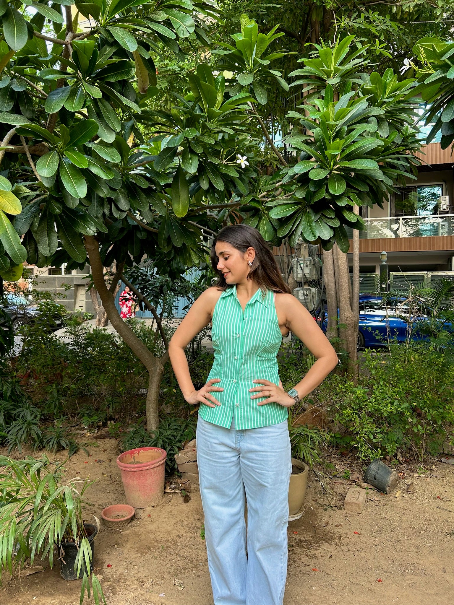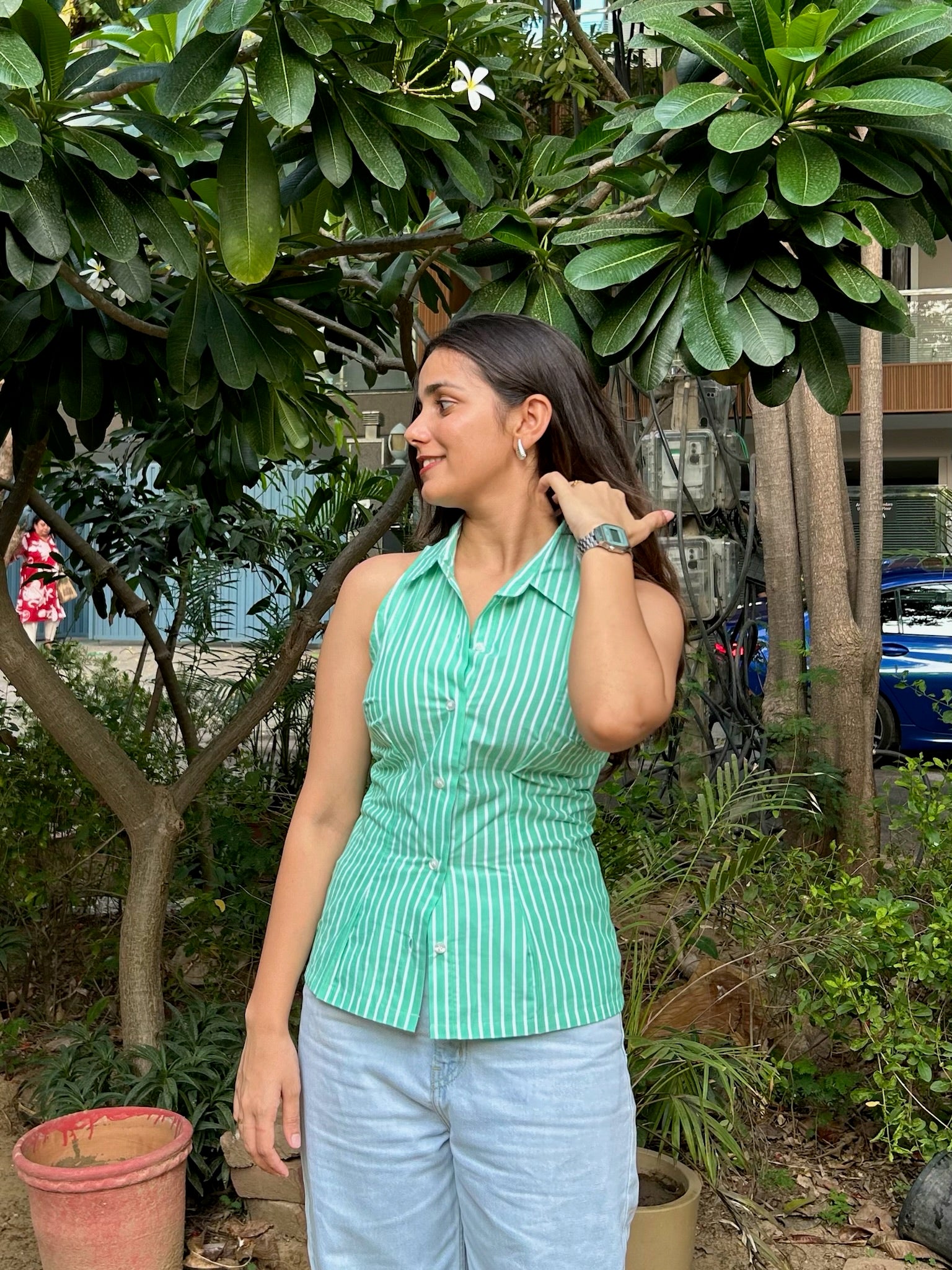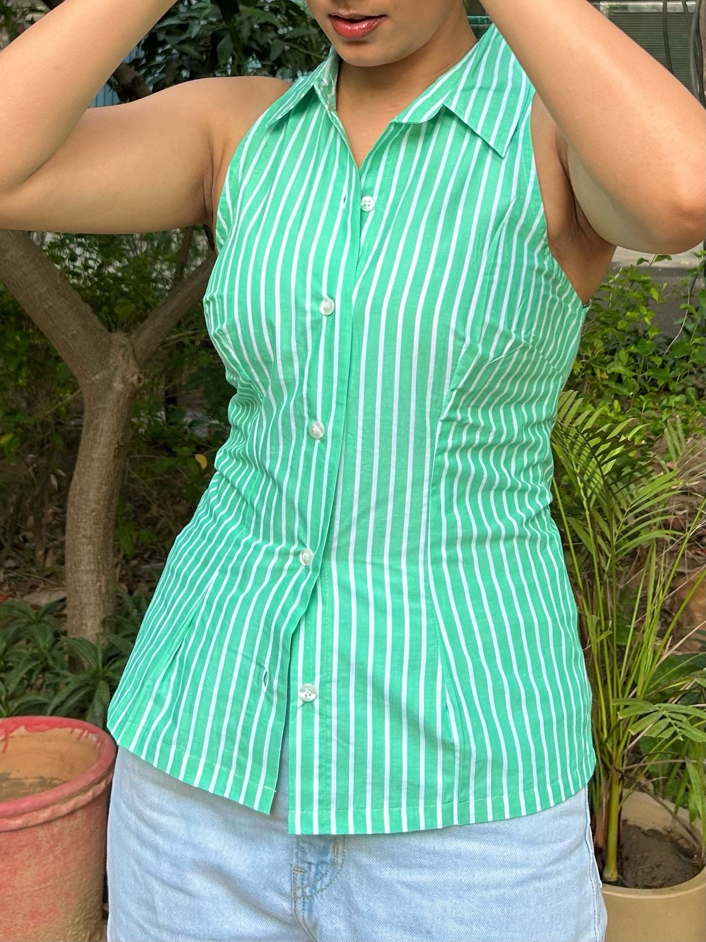 Green Halter Neck Fitted Shirt – Tie-Back Detail
