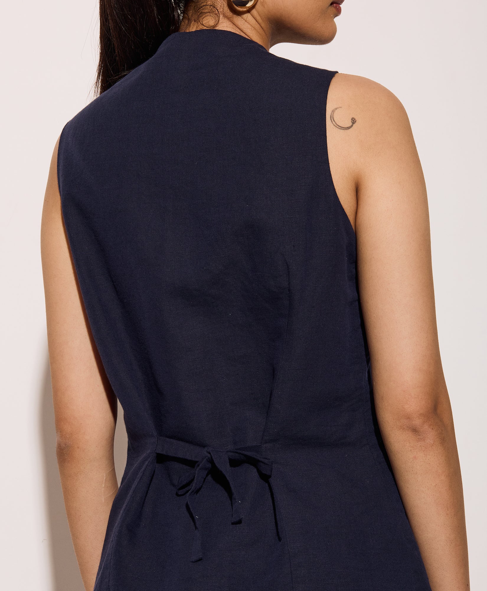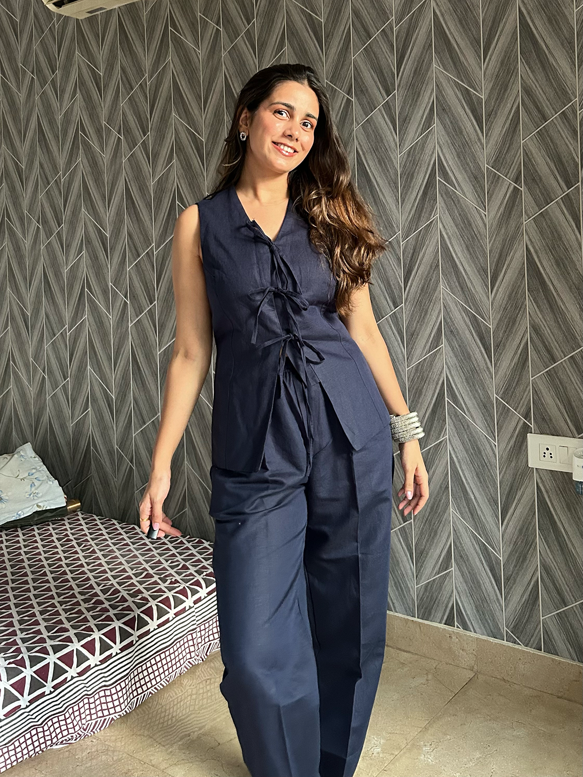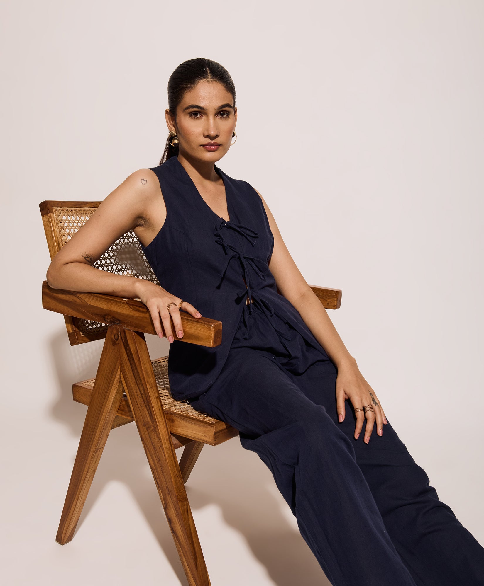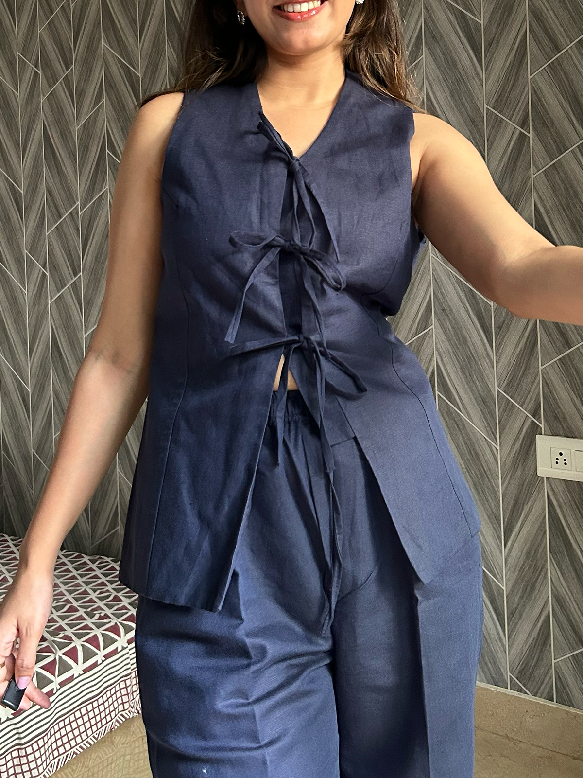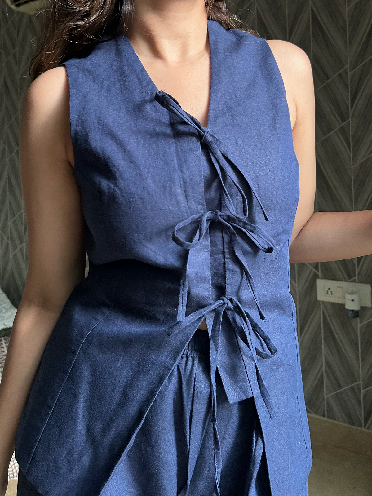 Add a refreshing twist to your summer wardrobe with our Navy Blue Linen Vest. Crafted from a lightweight, breathable linen blend, this sleeveless vest is the perfect mix of comfort and polish. The standout feature? A series of soft, self-fabric bows running down the front, adding a touch of playful elegance to a structured silhouette.