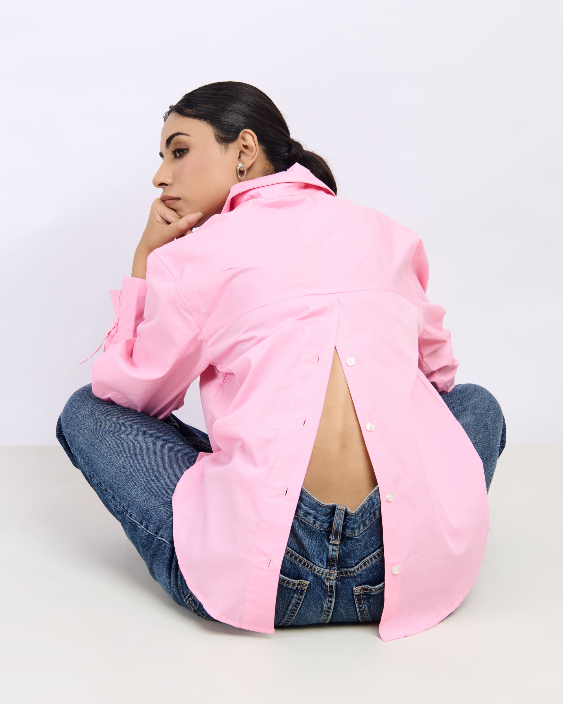 Keywords: pink open back shirt, shirt with back buttons, bow cuff shirt, stylish pink shirt for women, designer cotton shirt