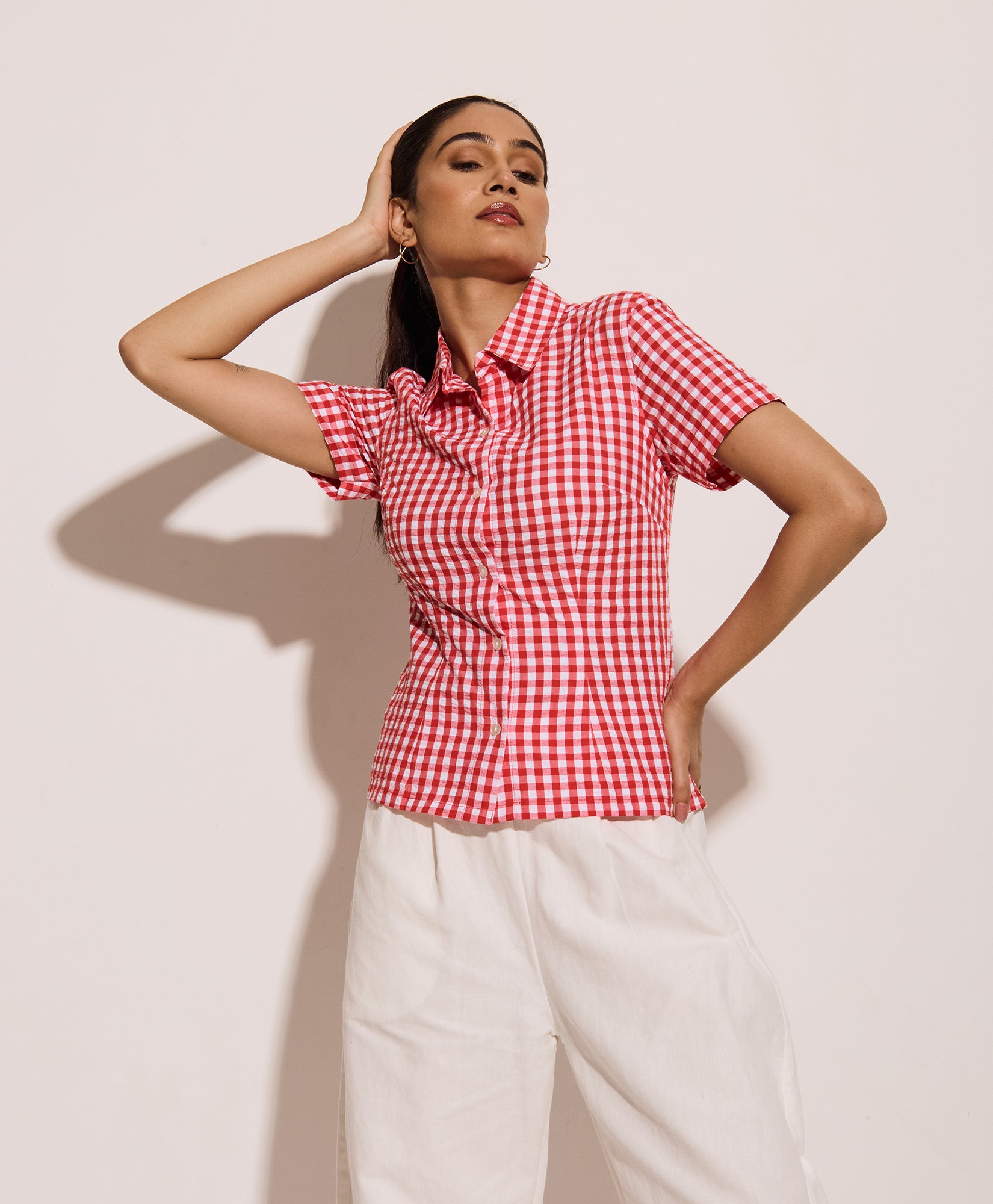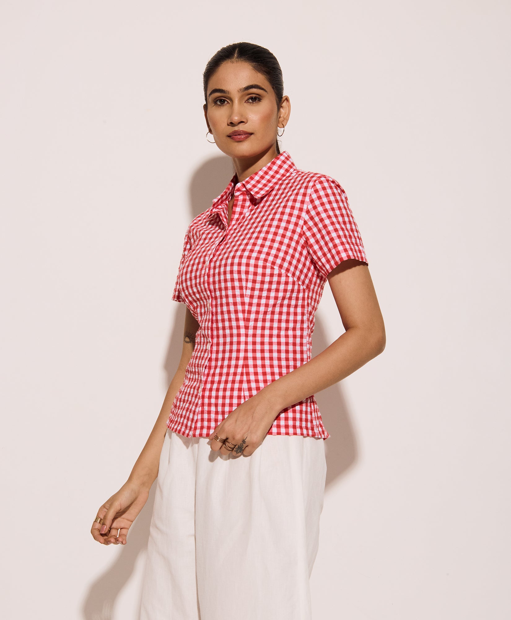 Red Gingham Half Sleeves Fitted Shirt – Cotton Seersucker Shirt with Tie-Back Detail