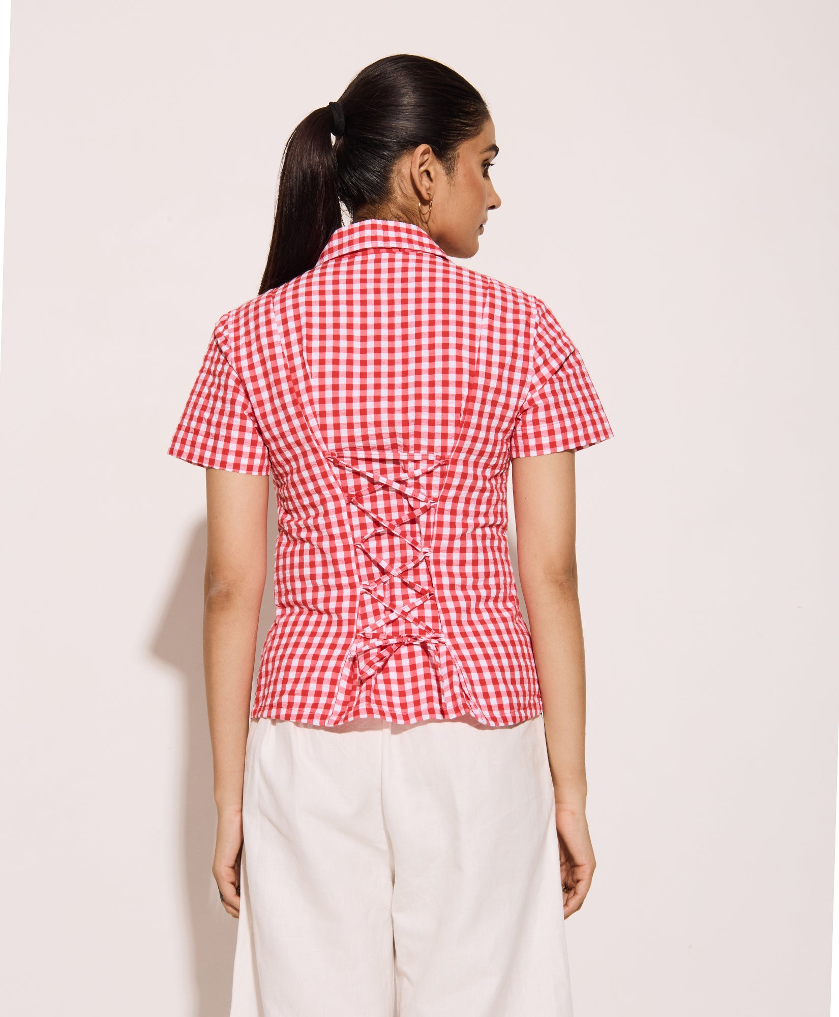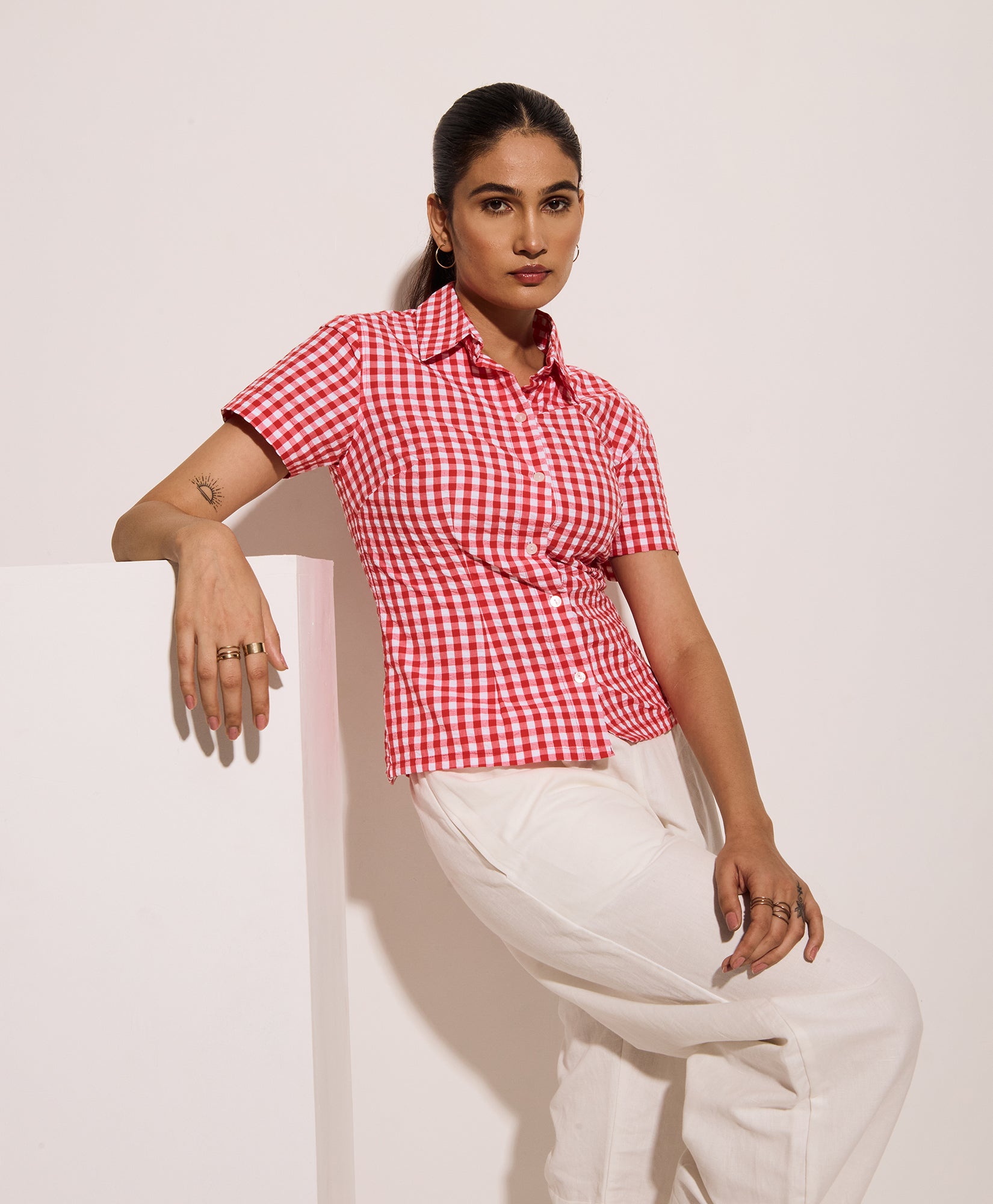 This red gingham half sleeves fitted shirt is designed with a front button-down closure and a classic collar for timeless appeal. The tailored silhouette features a unique lace-up tie back, offering an adjustable fit and subtle detail. Lightweight cotton fabric ensures comfort, making it ideal for summer workwear, travel, or casual outings. The red gingham pattern adds a versatile touch, easily paired with trousers or skirts for effortless styling. This fitted gingham shirt with a tie-back detail is a wardrobe essential for refined, everyday looks and makes a statement for both weekday and weekend wear