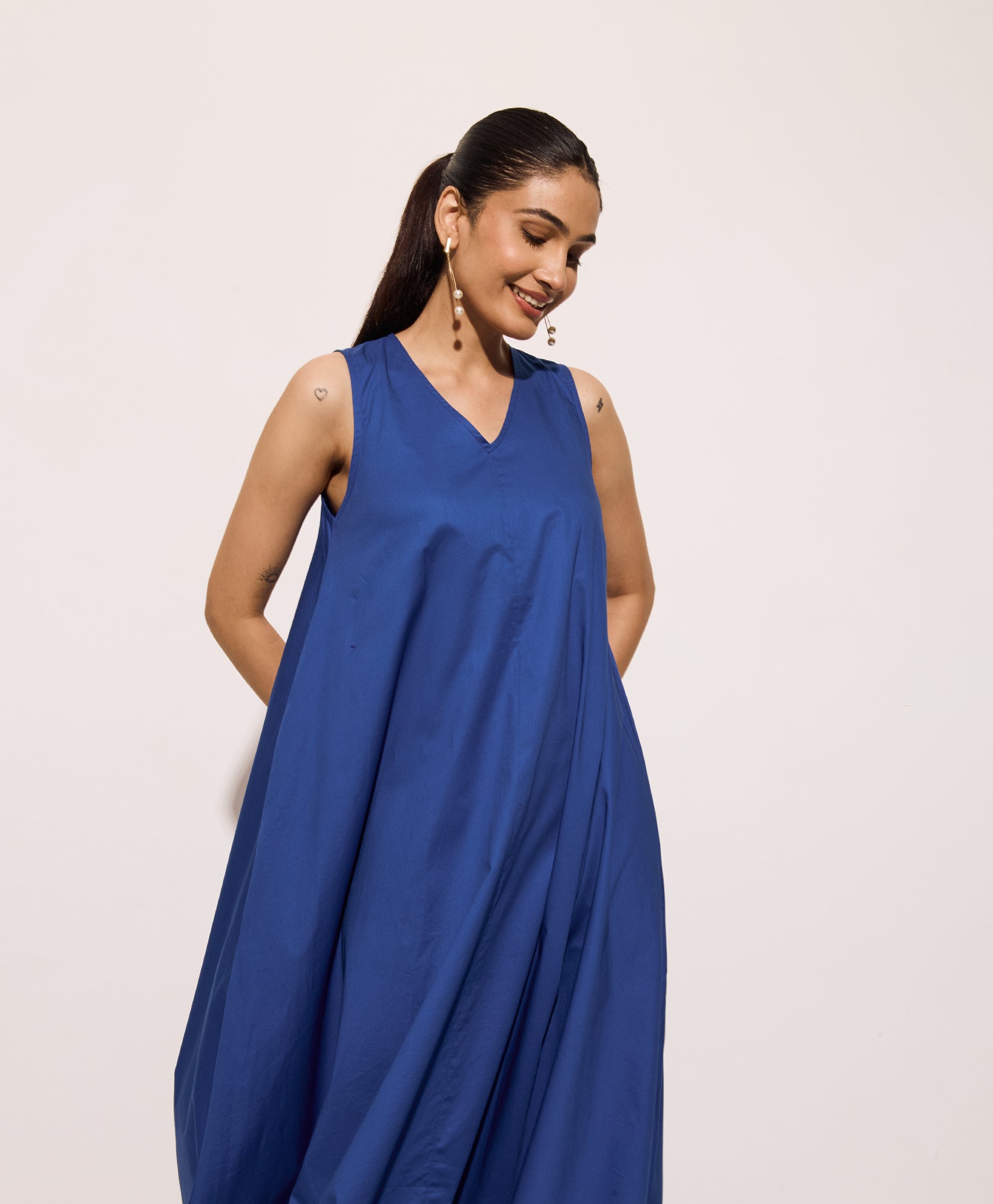 Effortless elegance meets modern ease in this beautifully tailored beige poplin dress. Crafted from breathable, lightweight cotton poplin, this A-line swing silhouette drapes gently to create a relaxed yet refined shape. The high neckline and sleeveless cut give it a polished edge, while the generous flare offers movement and comfort.