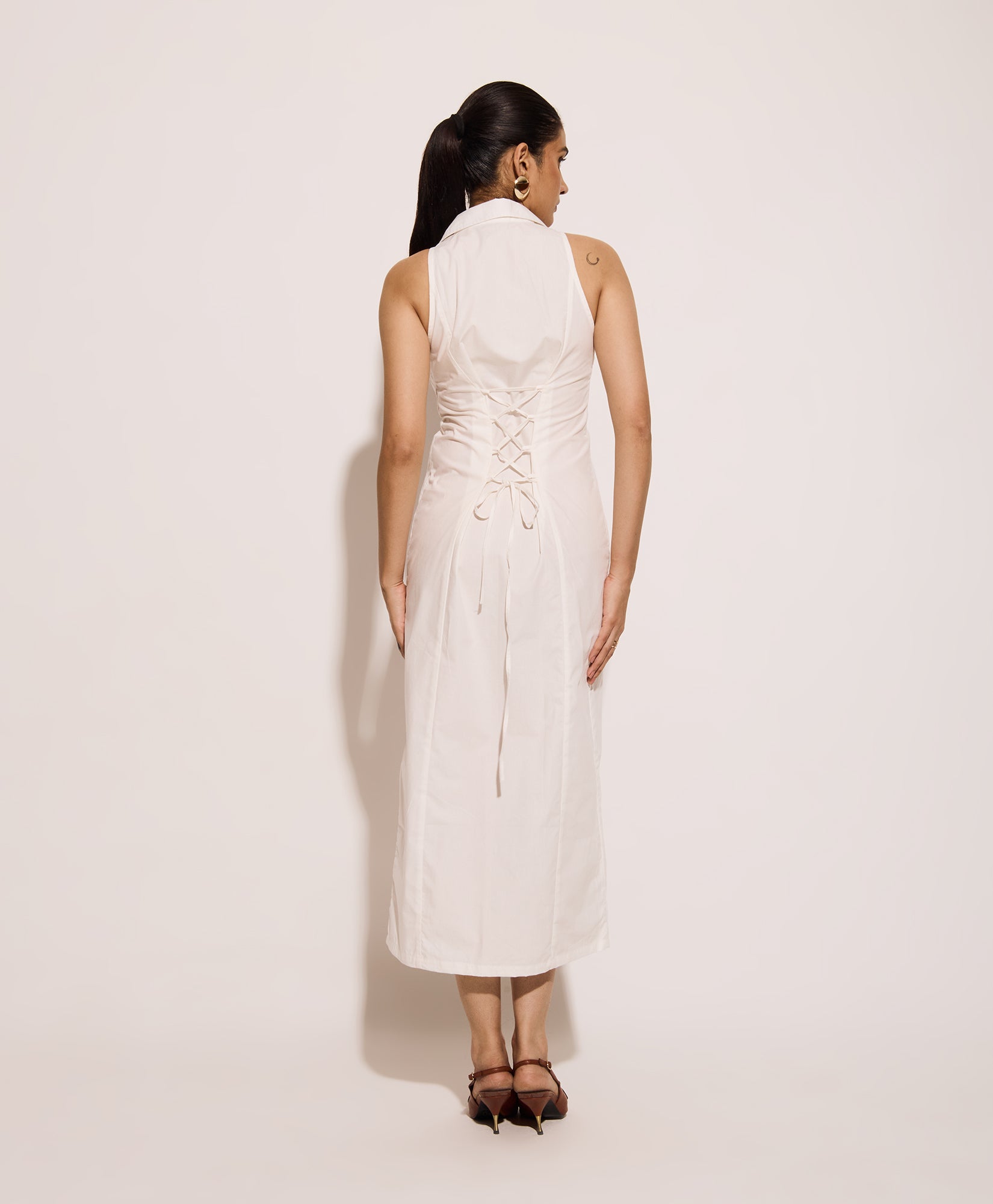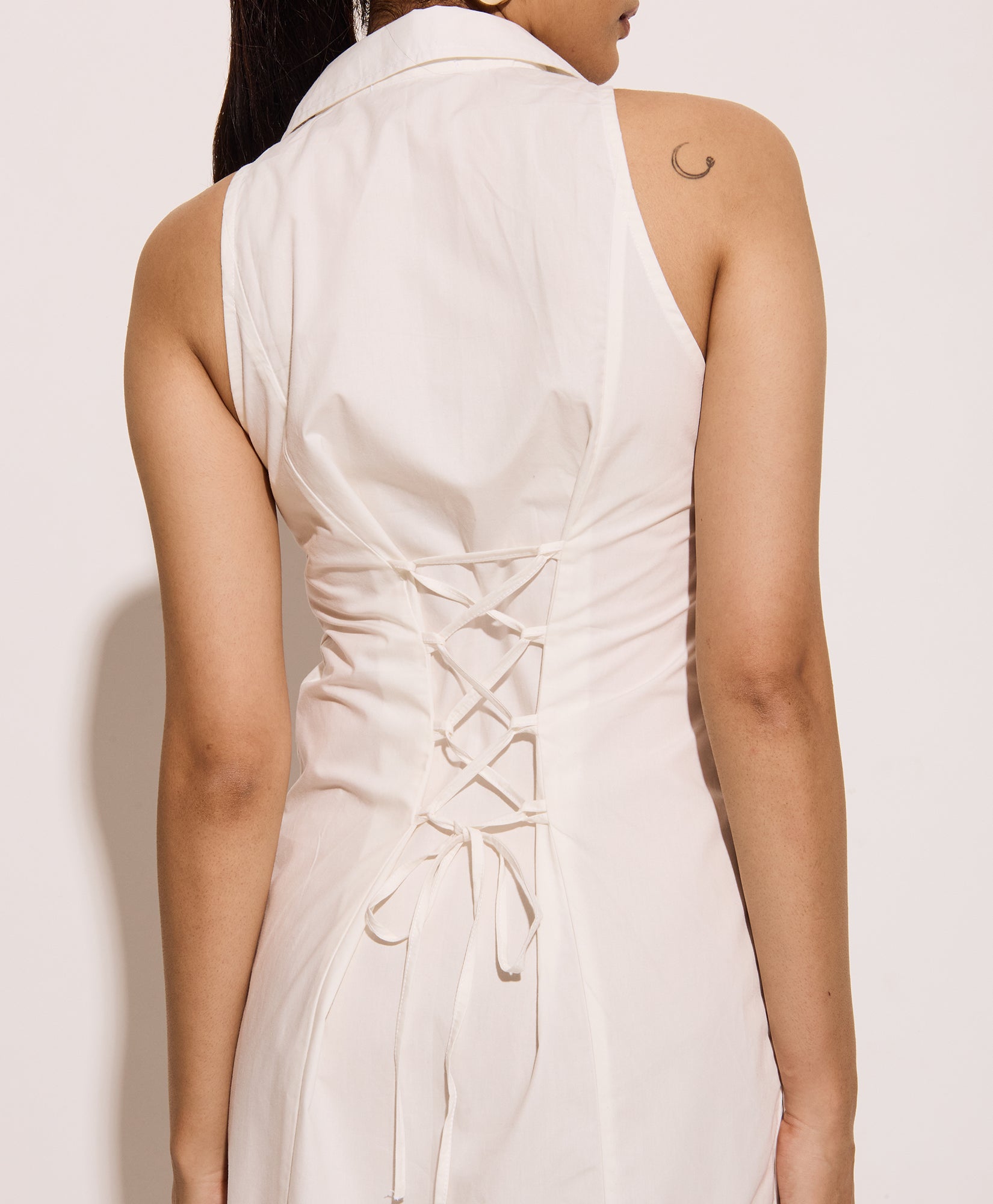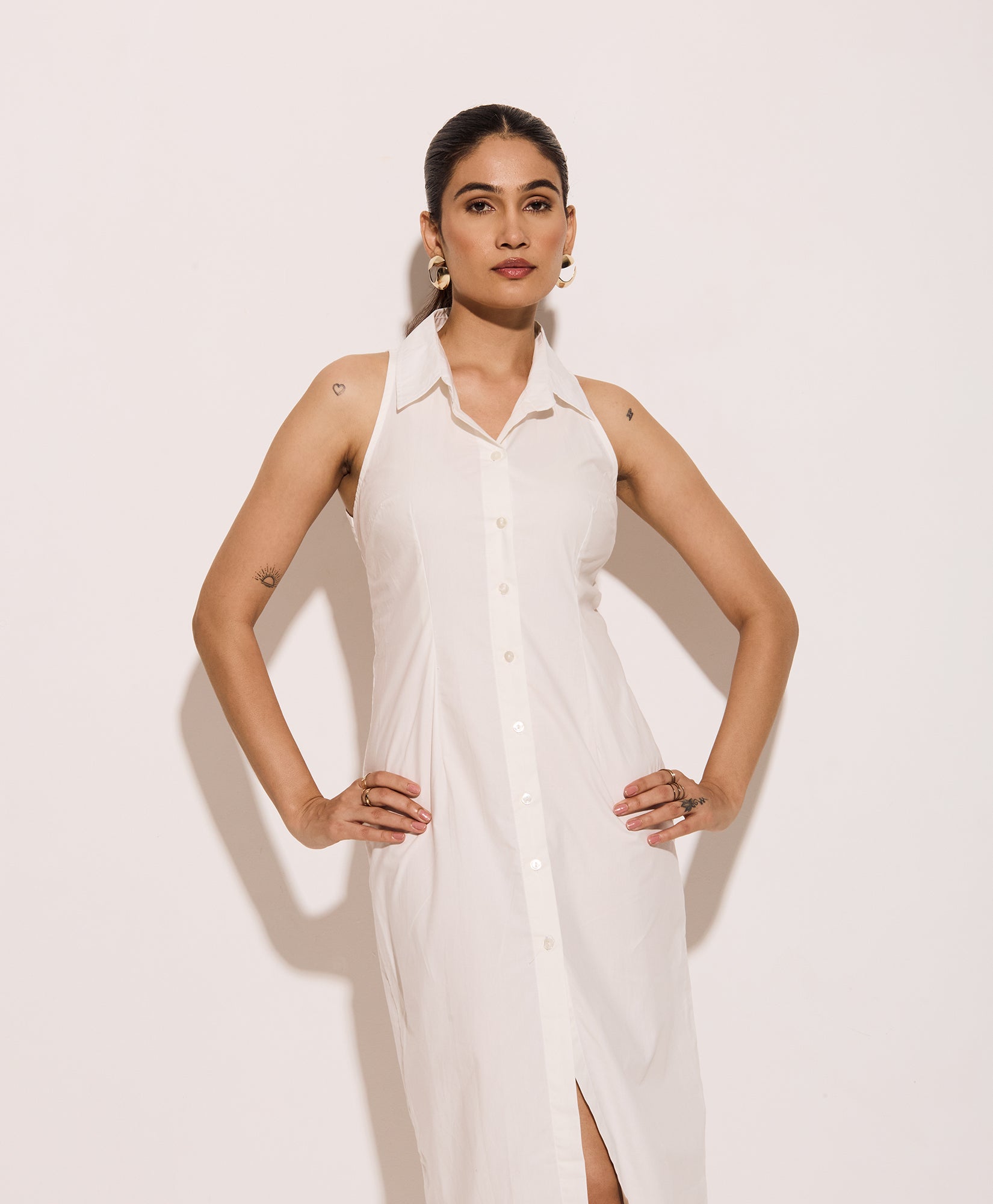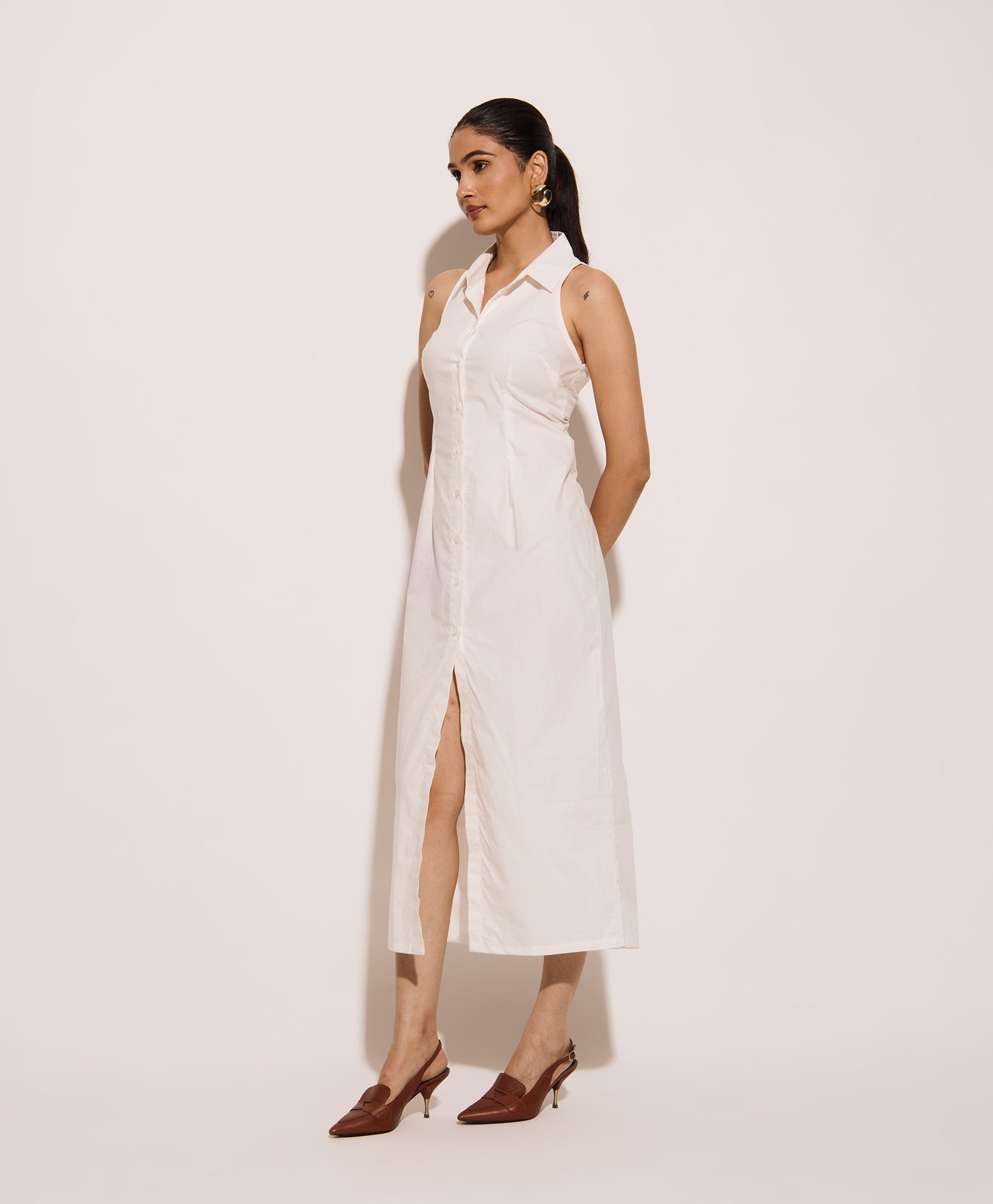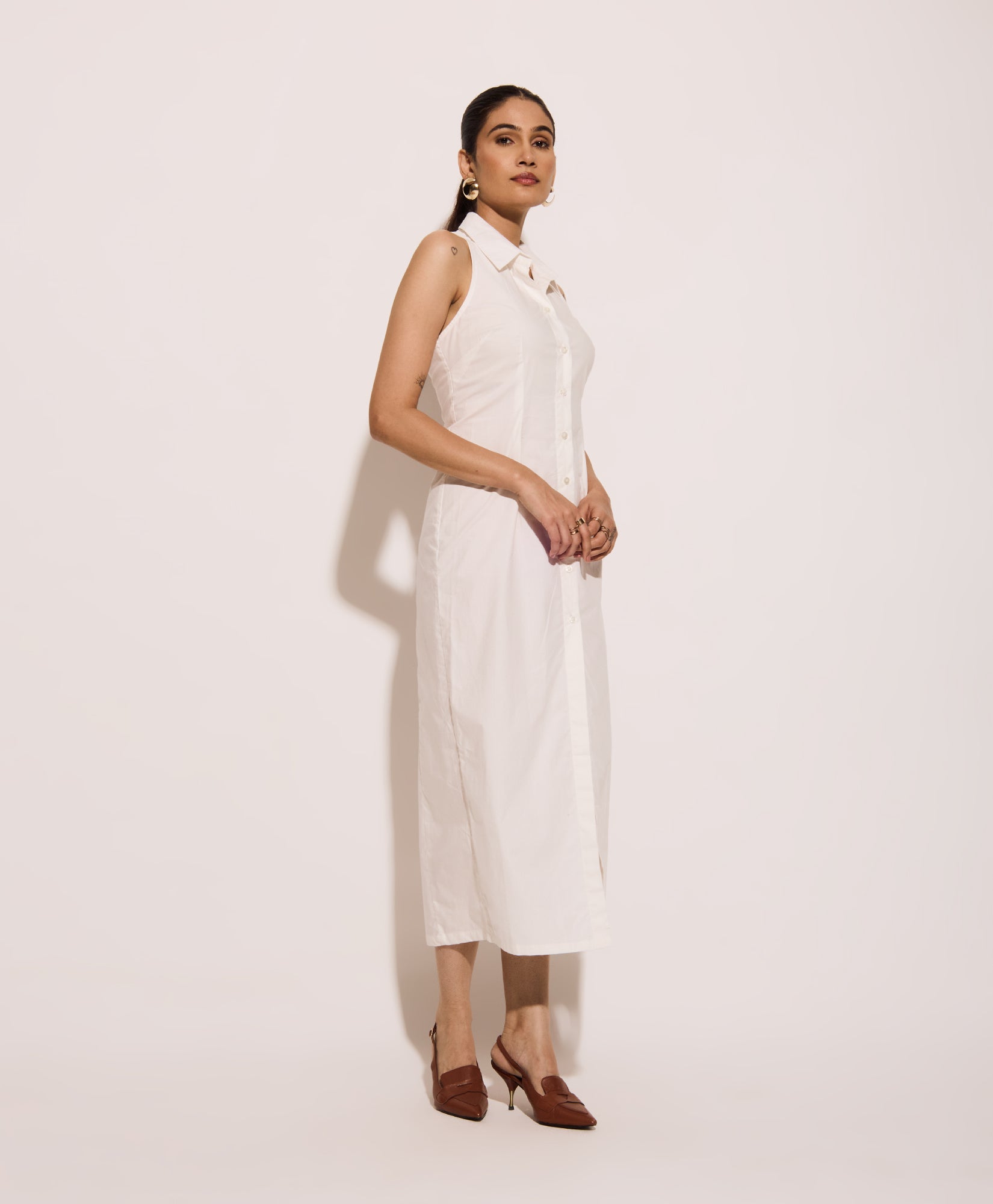 Effortless elegance meets modern ease in this beautifully tailored beige poplin dress. Crafted from breathable, lightweight cotton poplin, this A-line swing silhouette drapes gently to create a relaxed yet refined shape. The high neckline and sleeveless cut give it a polished edge, while the generous flare offers movement and comfort.