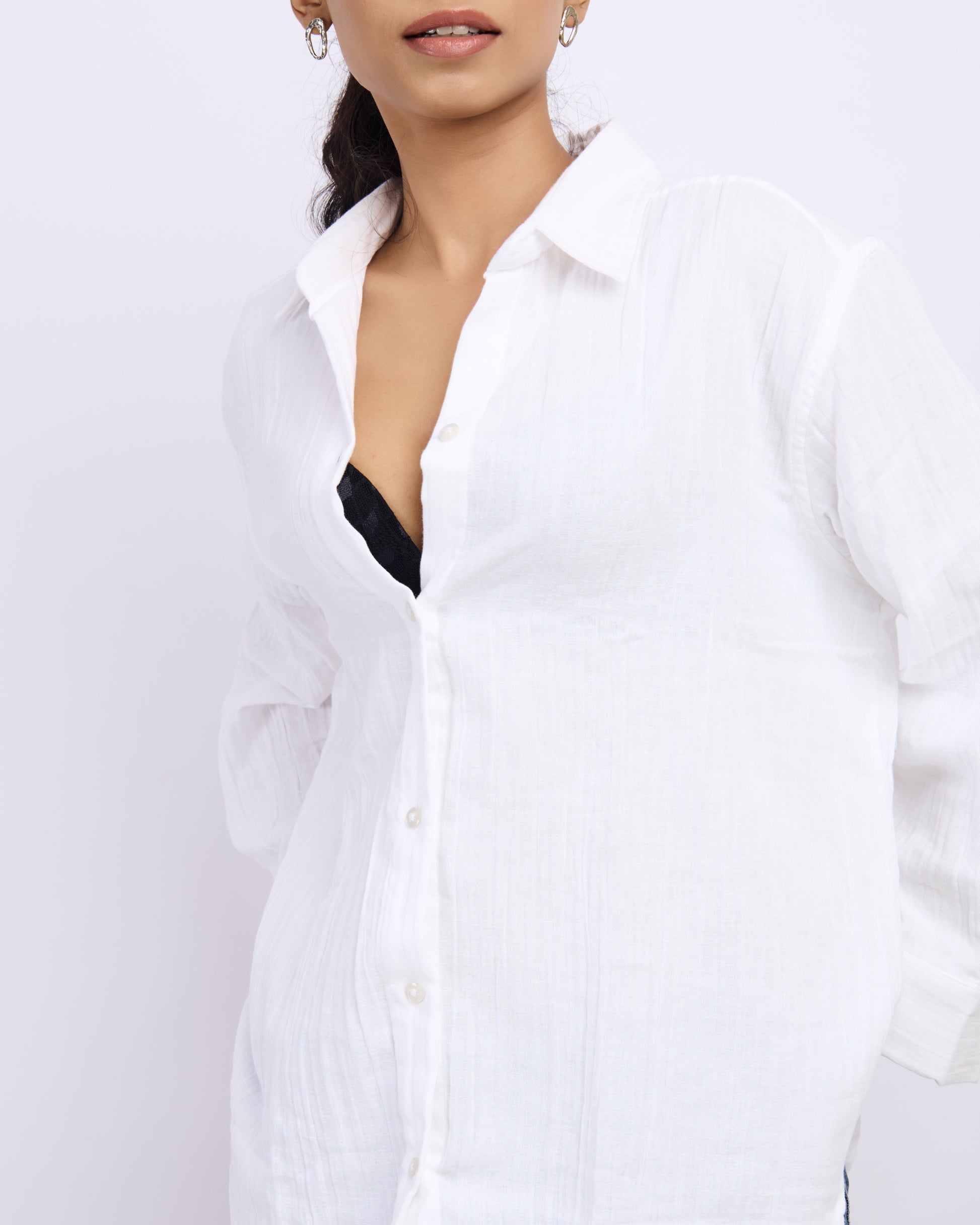 Whether paired with matching linen pants or styled with your favorite denim, this lightweight white gauged shirt is a versatile must-have that transitions seamlessly from day to night.