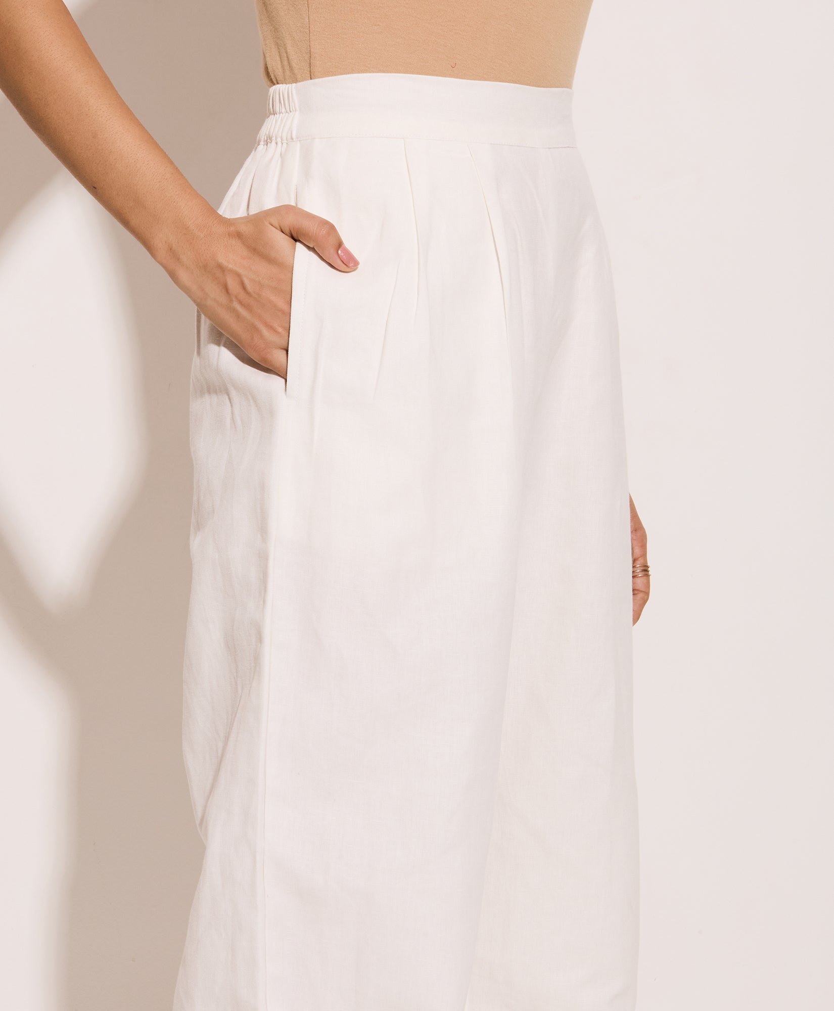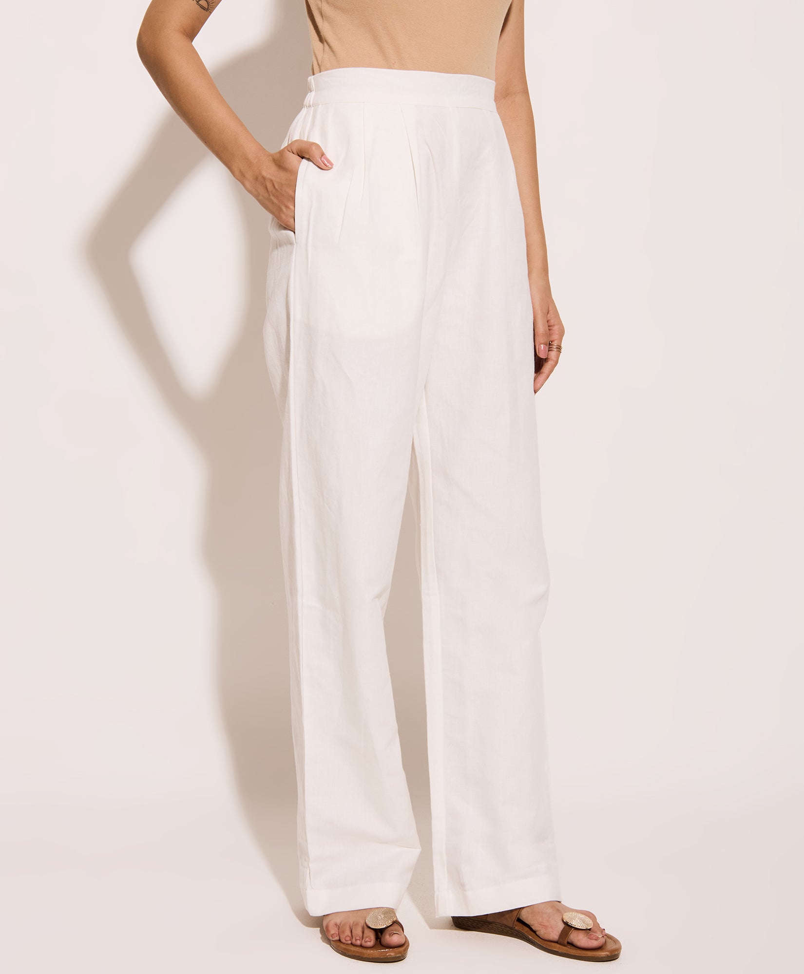 Clean, effortless, and endlessly wearable — these White Linen Pants bring a touch of elegance to everyday ease. Crafted from breathable cotton-linen, they feature a pleated front for a tailored look and an elasticated back for all-day comfort. The relaxed straight-leg silhouette moves with you, making them perfect for everything from weekend errands to breezy vacations. Crisp, lightweight, and timeless — these pants are made to live in.